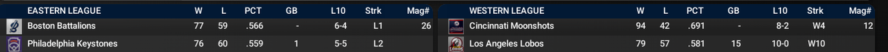 The Cinicinnati Moonshots have had an incredible year. Second place Los Angeles has won 10 in a row and the Moonshots are still 15 games up. In the Eastern League, there is quite a race between last year's winner, Boston, and the Philadelphia Keystones. Philly is looking for their first pennant.