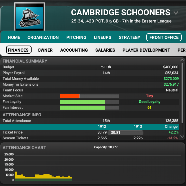 The Cambridge Schooners have largely struggled so far in their WBL history. They began as the Providence Silver Stars and finished second in the league's inaugural season but the team quickly picked up stakes and moved about 40 miles north to Cambridge.As Boston's "second team" the Schooners play in a tiny market and have had small payrolls. After many seasons finishing somewhere between 5th and 8th, they finished 2nd last year but are back in 7th in 1913. They play in small Schooner Stadium with the rollercoaster in back of right field and wear teal uniforms.