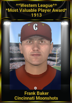 Frank "Home Run" Baker continues to have huge seasons for the defending champion Cincinnati Moonshots. Cincy is in the lead again in the Western League and Baker is hitting .347. He was named MVP for 1913 as he was in 1912.