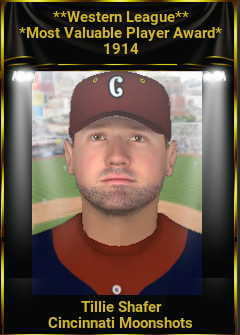 The Cincinnati Moonshots have been the surprise of the league thus far, jumping out to an 8 game lead in the Western League. They have 5 of the 8 top batting averages in the West including Tillie Shafter, Frank Baker, Dode Paskert, Wally Schang and Jimmy Walsh.