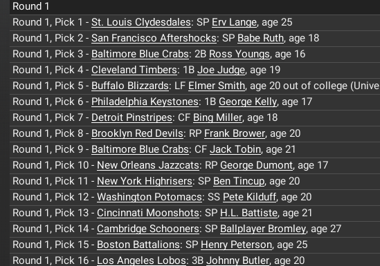 The St. Louis Clydesdales certainly had an opportunity with their #1 pick to take Babe Ruth. Instead they opt for Erv Lange, a 25 year-old pitcher who never made the majors. San Francisco picks Ruth although he already has a commit school and may or may not sign.