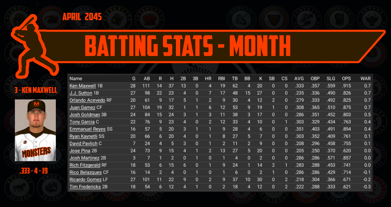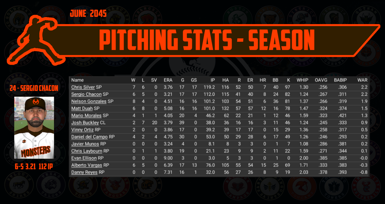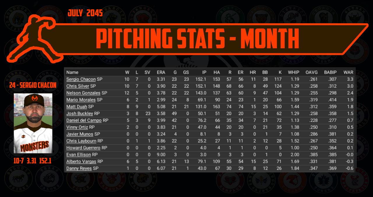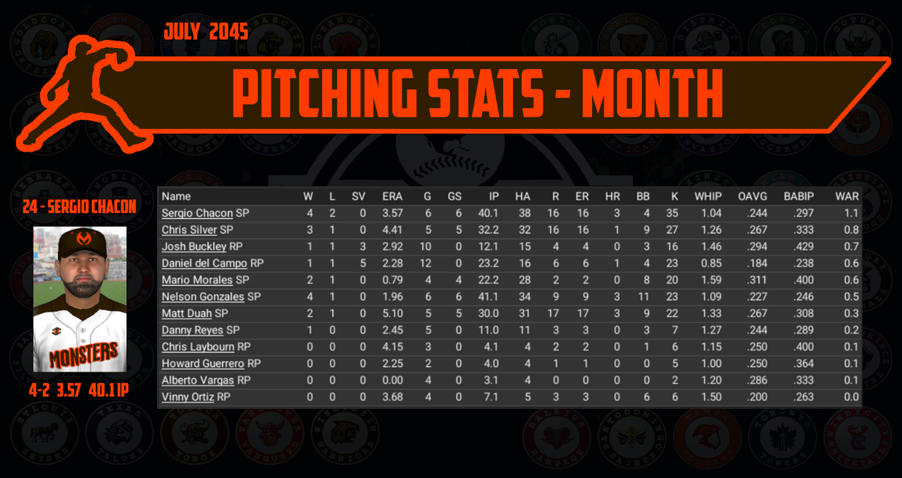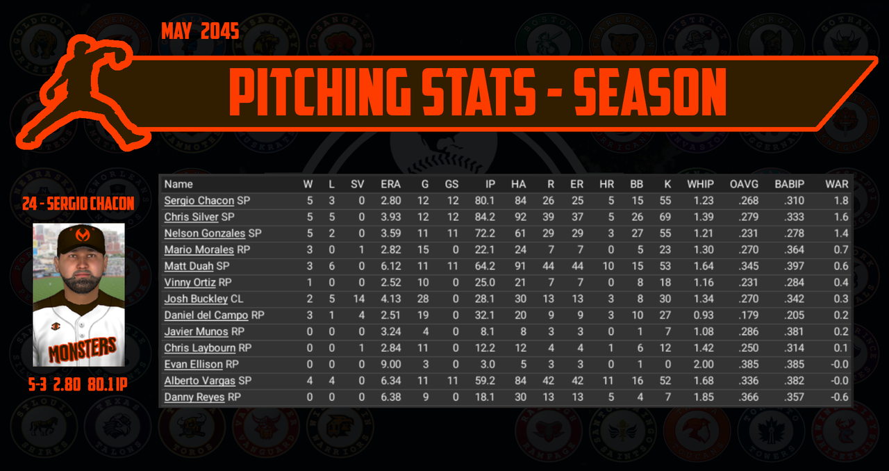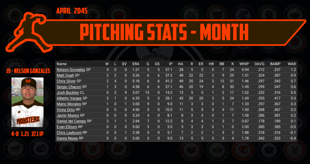 ![]() After starting off 0-3 in blowout losses, SP Silver composed himself and returned to form (somewhat) by the end of the month. Newly acquired SP Chacon has not pitched like he hoped in this prove it season. SP Duah and Vargas are also struggling, with Vargas' weakness of the 3-run homer returning in full force. Morales has adjusted to his new role in the bullpen, and Buckley has straightened himself out after 2 early, deflating losses. Rookie Nelson Gonzales has burst into the '45 season with an outstanding month including a complete game shutout in his first start. |