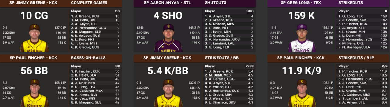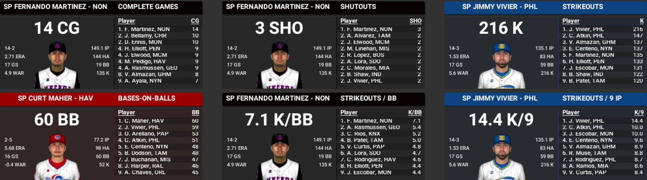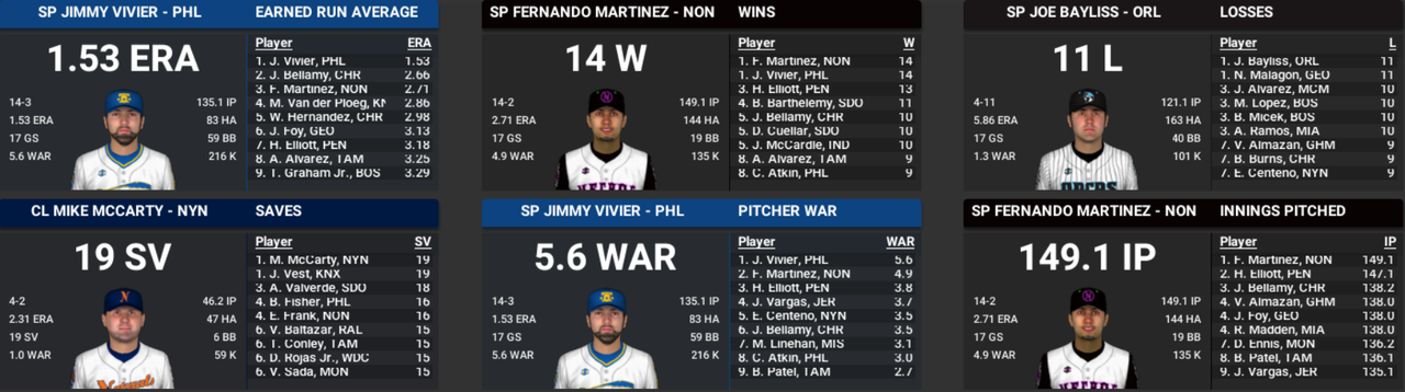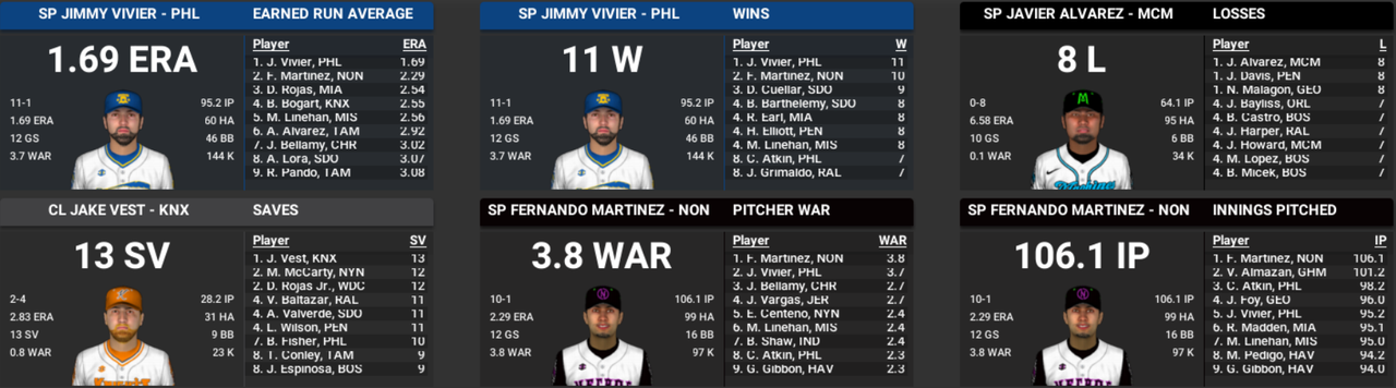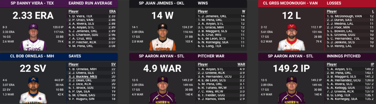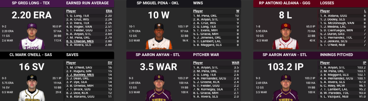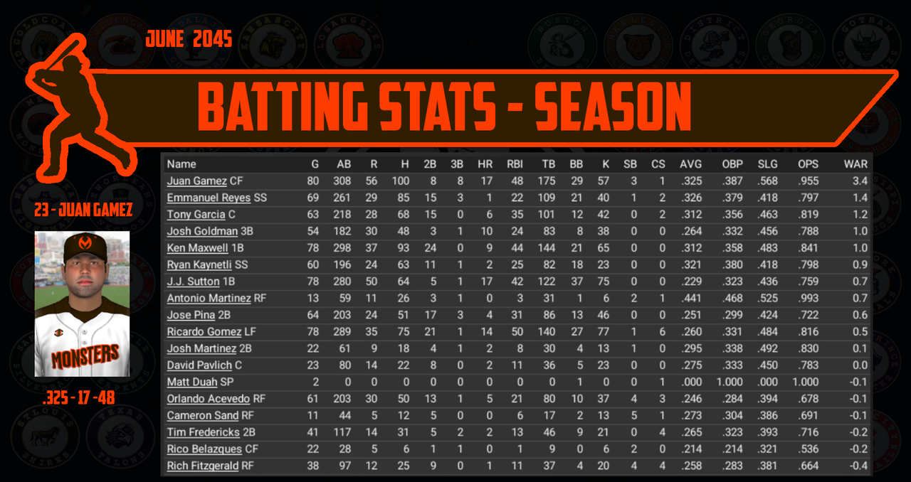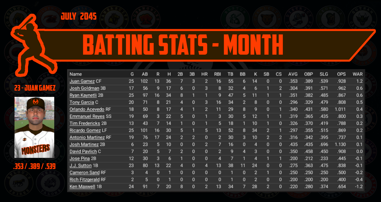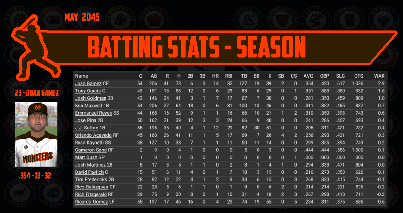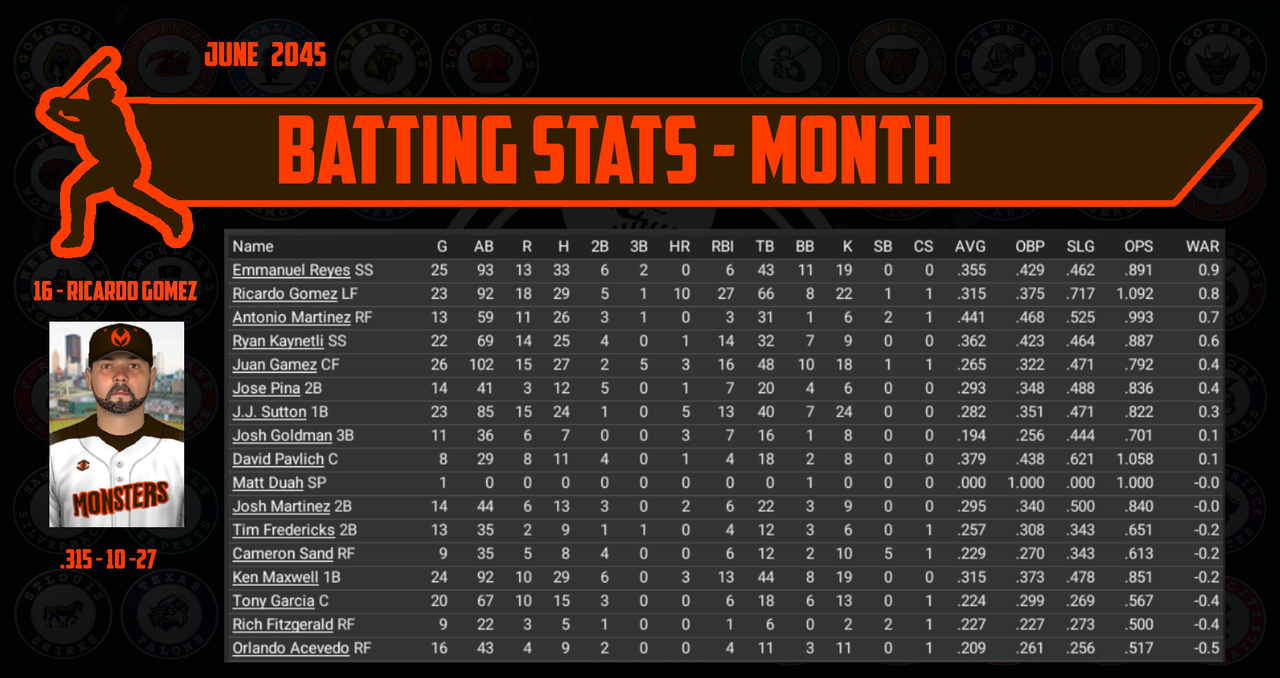 ![]() After starting off 0-3 in blowout losses, SP Silver composed himself and returned to form (somewhat) by the end of the month. Newly acquired SP Chacon has not pitched like he hoped in this prove it season. SP Duah and Vargas are also struggling, with Vargas' weakness of the 3-run homer returning in full force. Morales has adjusted to his new role in the bullpen, and Buckley has straightened himself out after 2 early, deflating losses. Rookie Nelson Gonzales has burst into the '45 season with an outstanding month including a complete game shutout in his first start. |