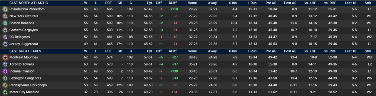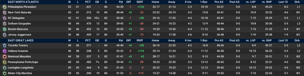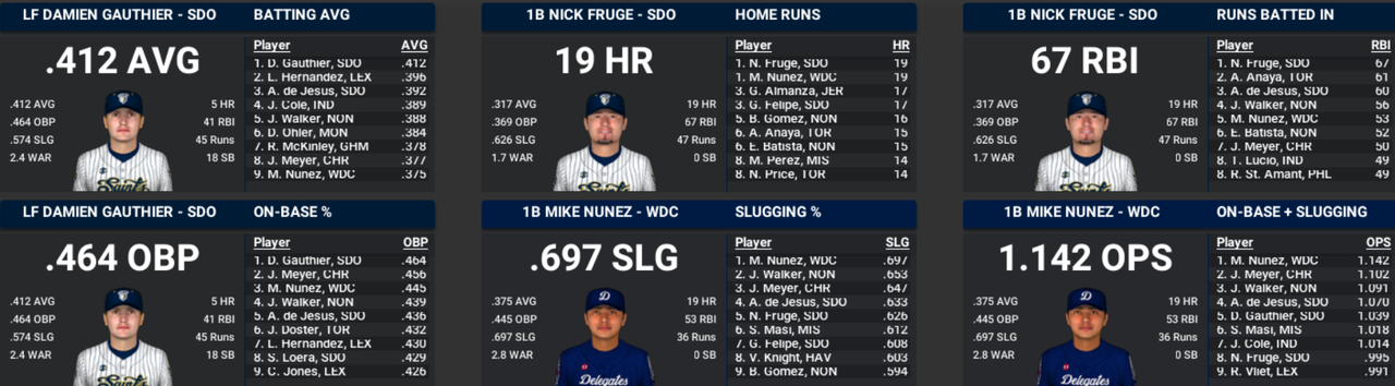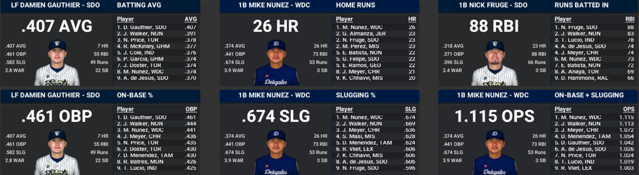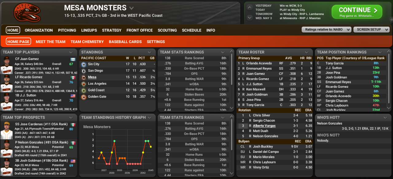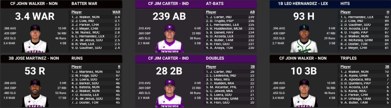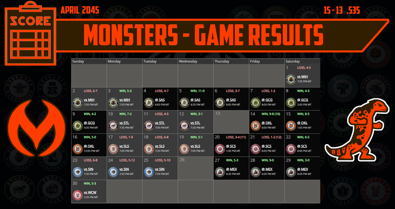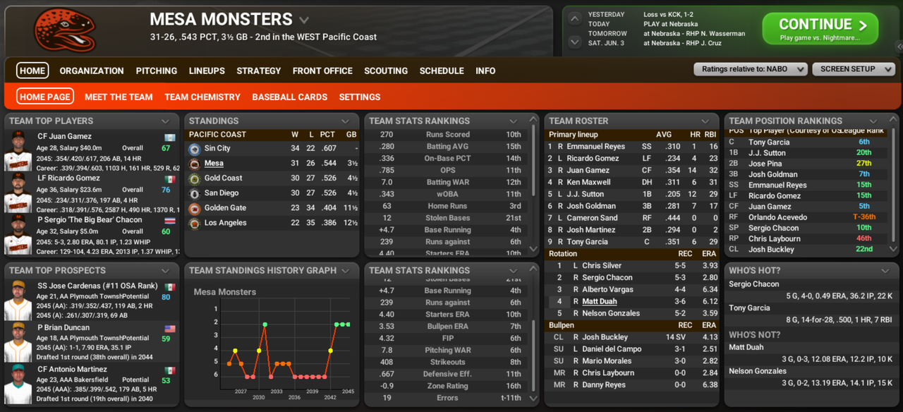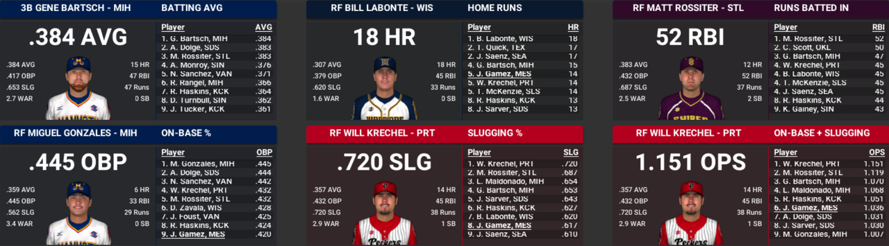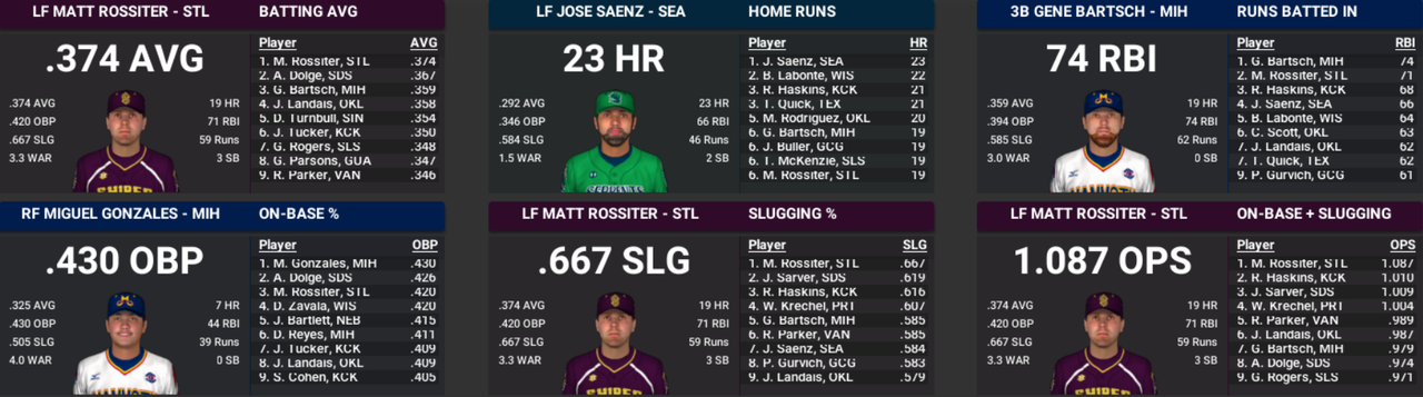 ![]() After starting off 0-3 in blowout losses, SP Silver composed himself and returned to form (somewhat) by the end of the month. Newly acquired SP Chacon has not pitched like he hoped in this prove it season. SP Duah and Vargas are also struggling, with Vargas' weakness of the 3-run homer returning in full force. Morales has adjusted to his new role in the bullpen, and Buckley has straightened himself out after 2 early, deflating losses. Rookie Nelson Gonzales has burst into the '45 season with an outstanding month including a complete game shutout in his first start. |