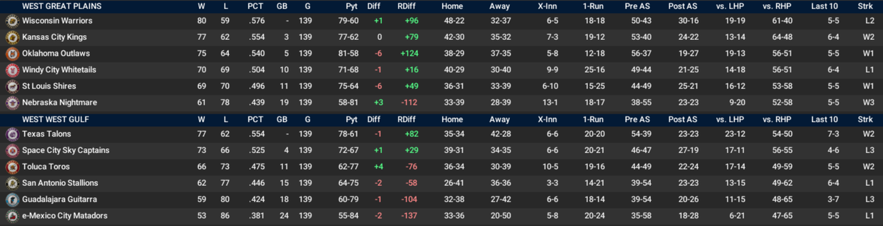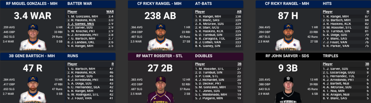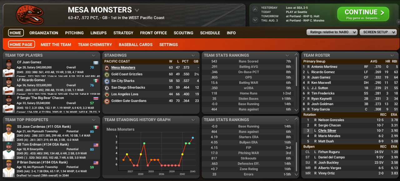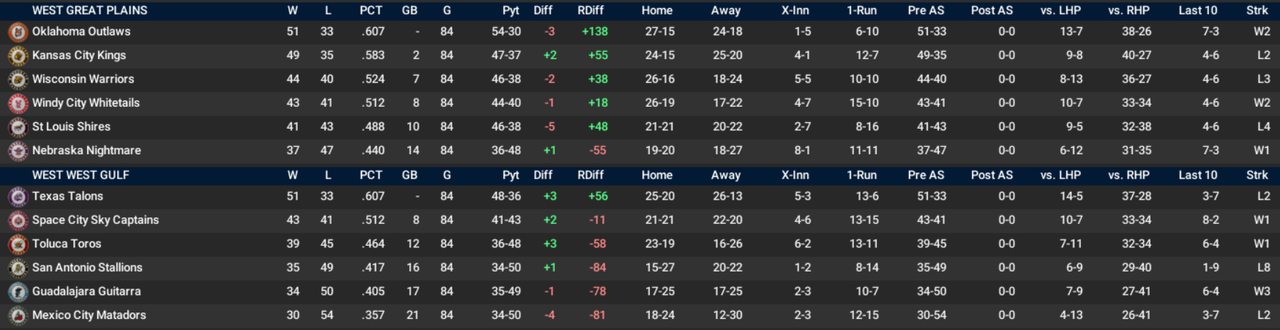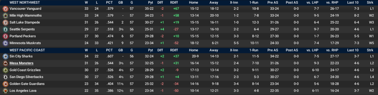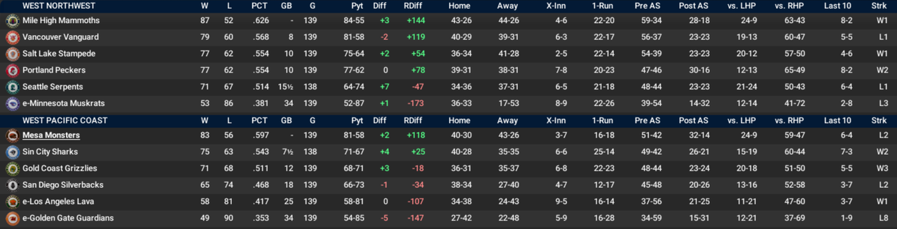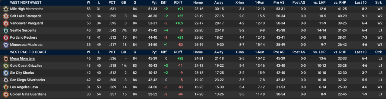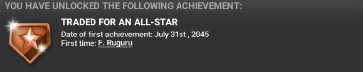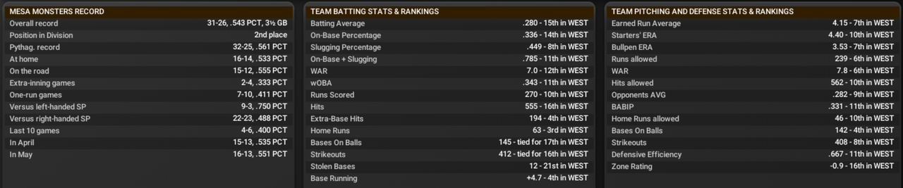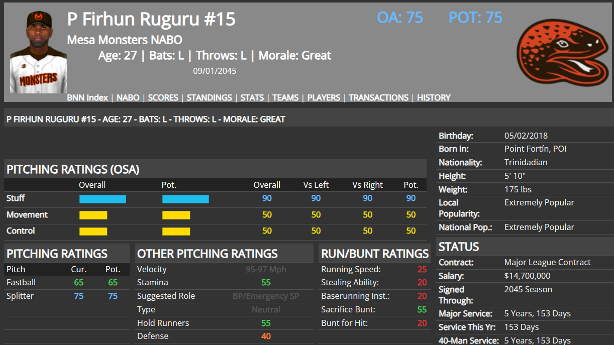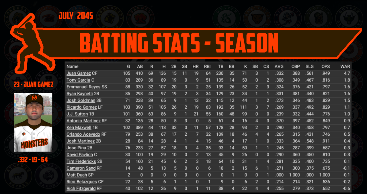 ![]() ![]() I didn't get the Acquire an AllStar achievement for trading for Jamez, because he somehow did not make the AS team despite being 2nd in voting for CF and putting up a .332-19-64 first half, producing 4.7 WAR in the process. Sin City, seemingly giving up on the playoff chase put their closer on the trading block and I acquired him at the trading deadline. The "All In" season continues. Somehow the fans still are not all that interested. CL Ruguru will be a free agent at the end of the season. Mesa Monsters Get ... ![]() Sin City Sharks Get ...