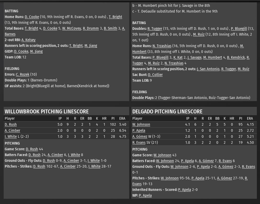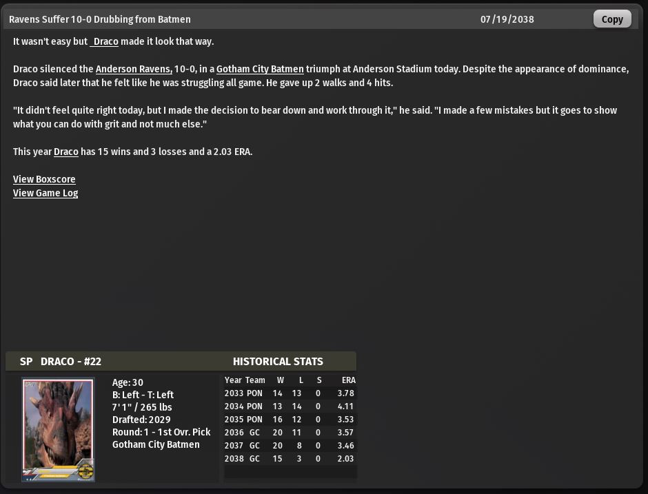 Gotham City SP Draco pitched a 4 h 14 k 2 bb CG SH. Cf Jon Hicks has a 3 HR game.