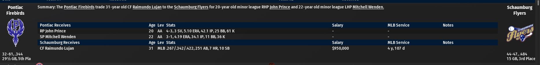 Bird City Falcons traded Lf Bryce Meeler to the Colorado Rockies for C Julio Lepe. Endor City Capitols traded Rp Cliff Flury & a minor league Sp to the San Francisco Giants for Rf Finley Sidford.
