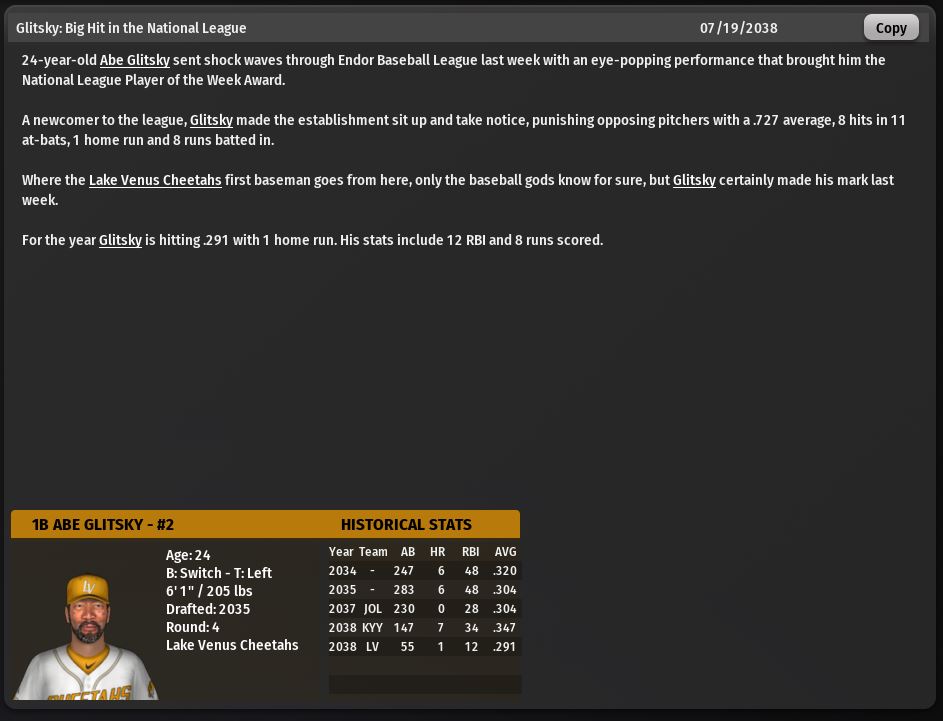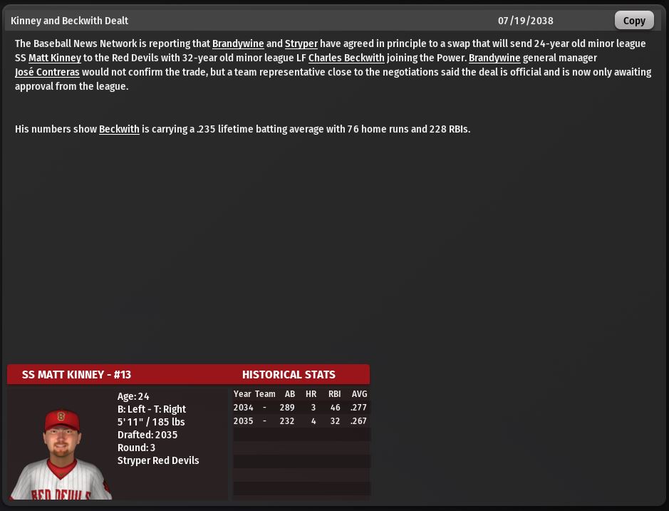 Cooperstown Cf Clark Kent becomes the 11th EBL player to hit 500 HR. NY Yankees traded 2 minor league SP to the Atlantis Sharks for 1b Dan Lincoln.