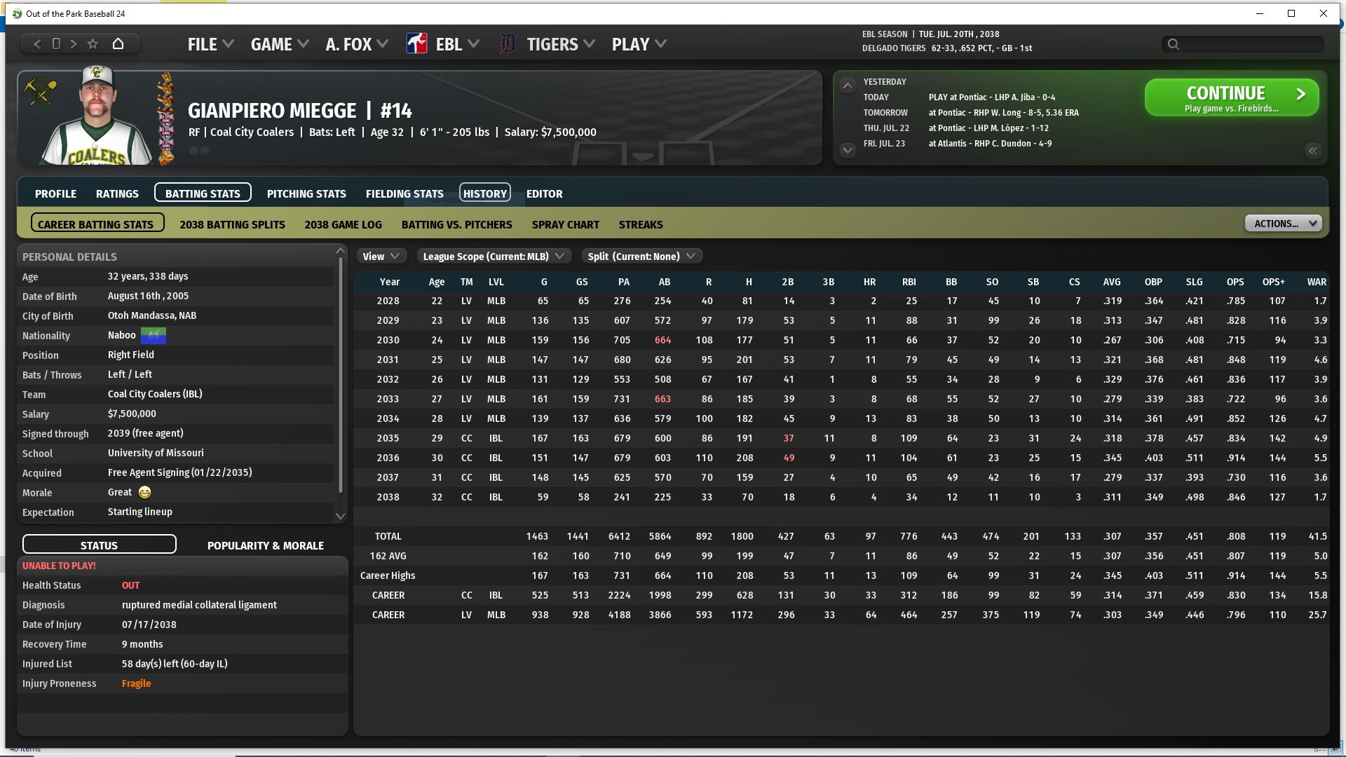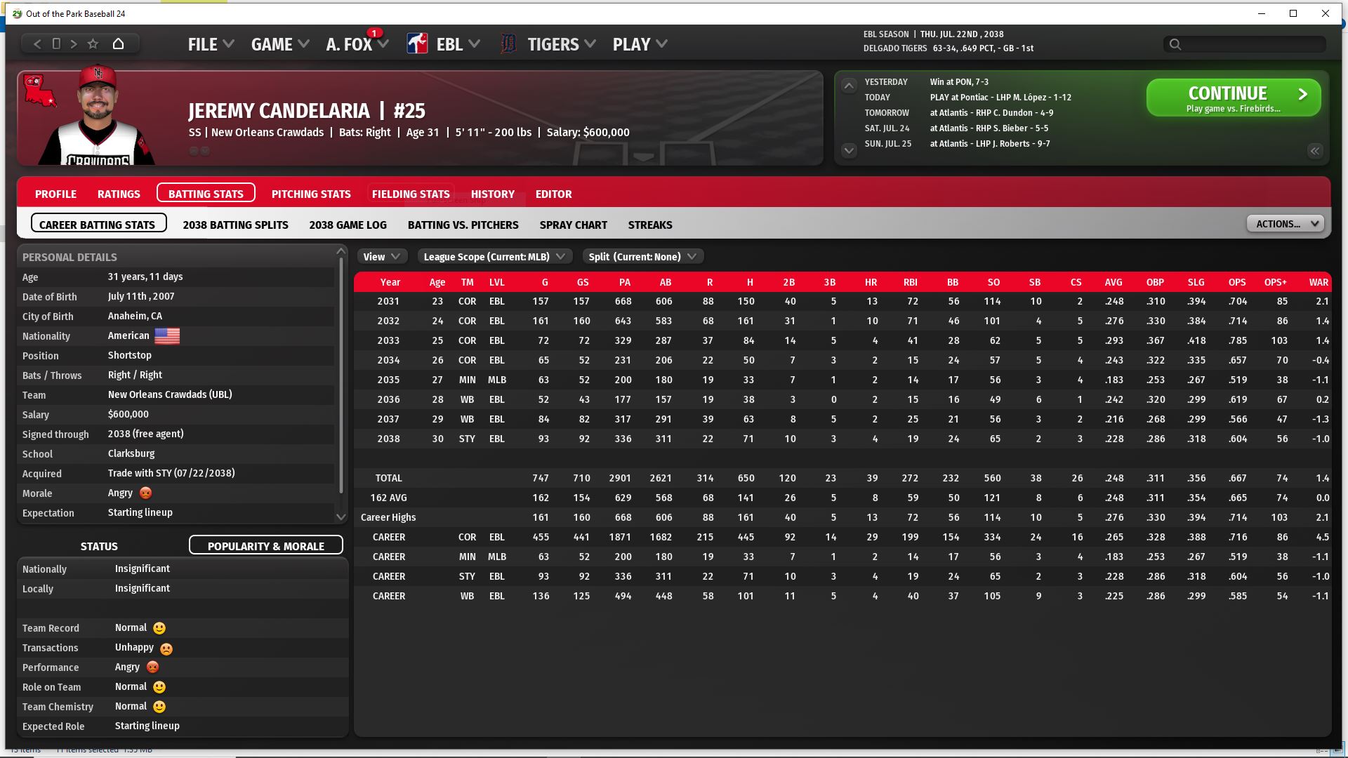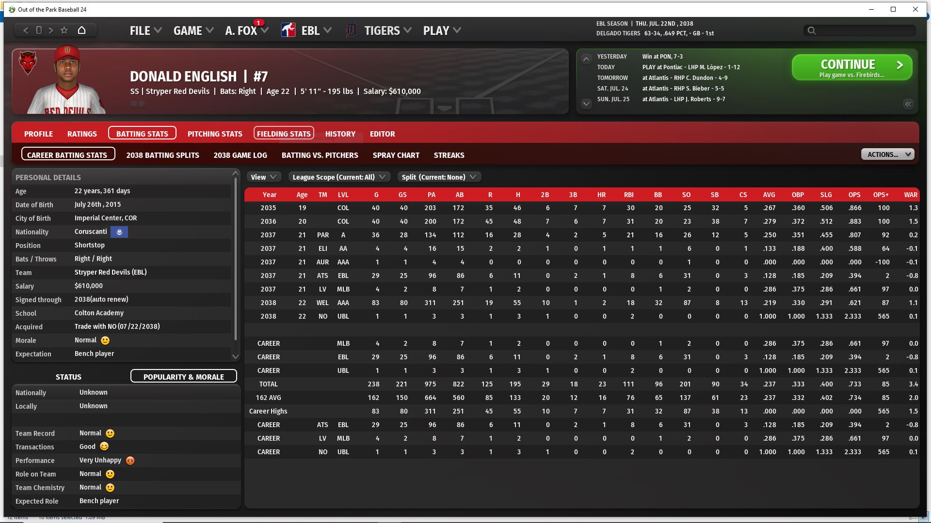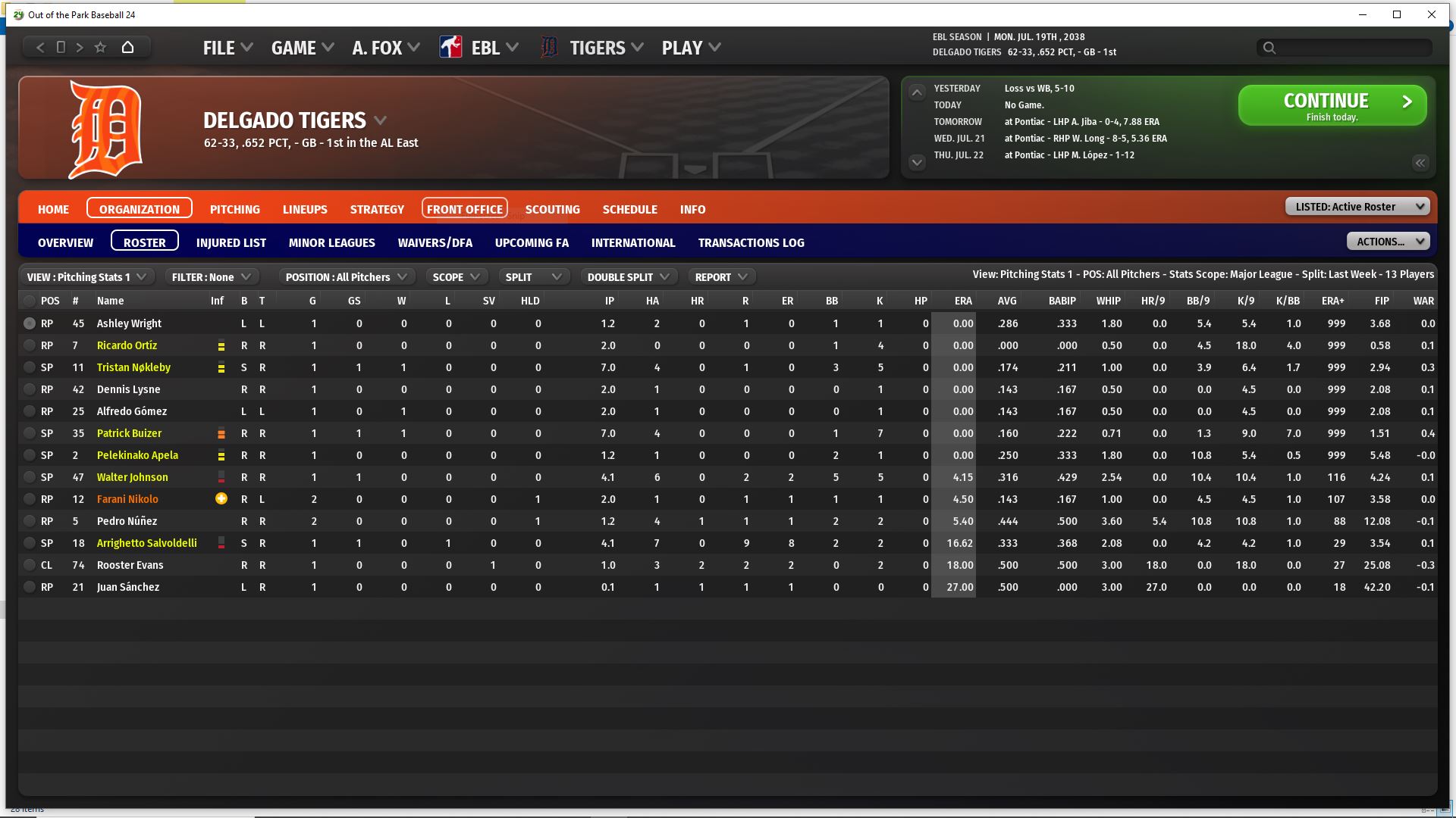 Taking 3 of 4 vs WB has gioven us a decent lead in the East for now. They have been playing terrible thus far in July but have made tons of roster moves, so I feel they are not leaving us yet. I demoted SS Jason Kidwell to AAA and recalled Of Oddvar Duong.Kidwell was struggling in limited ABs and Duong gives us defense and speed off the bench. Only 4 games since the all star break but thus far the offense was great and the rotation and pen did well for the most part. Doubtful i will make any more moves until Trade deadline day. We go to PON for 3 then to ATS for 3. We should go 5-1, 4-2.