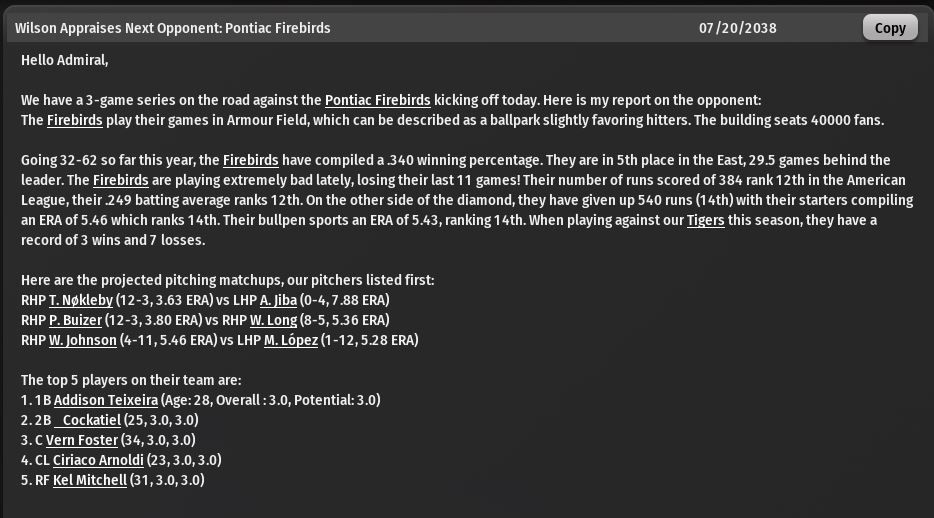 32-62 .340 29½ GB AL East 7-3 vs Firebirds Pontiac has been busy trading away many players over the last few weeks. They do have talent but this team is a long way from competing in this division. C Vern Foster gives them a bit of leadership that they lacked. While he isn't having a good season, I am sure that he can help motivate this team a bit. They have a rookie in Cf.