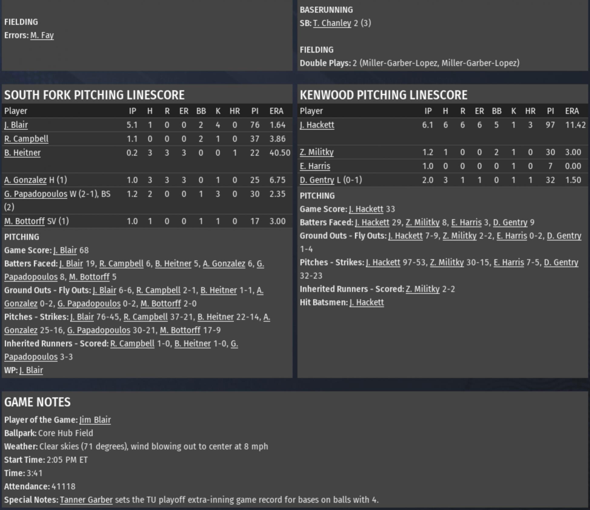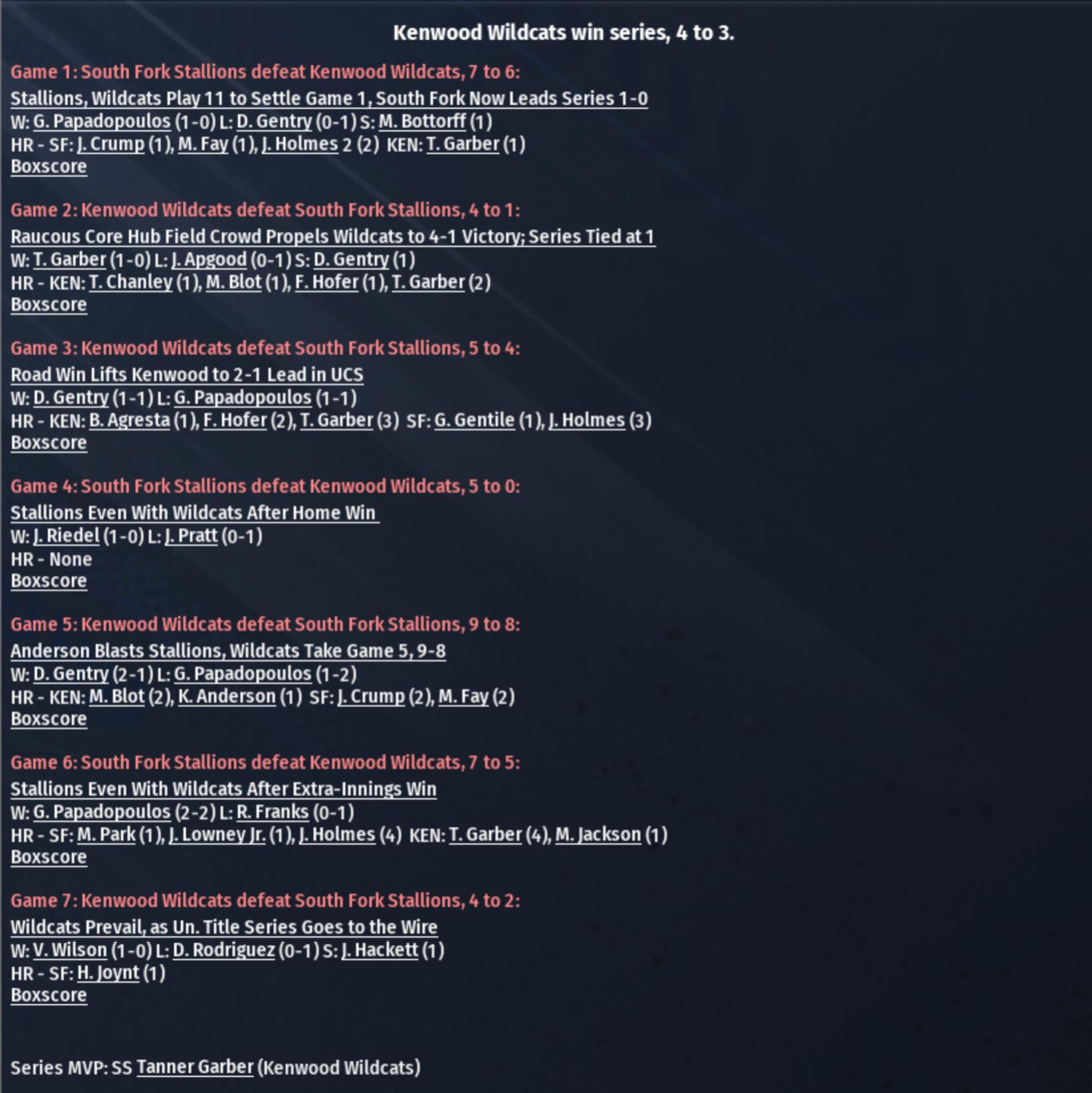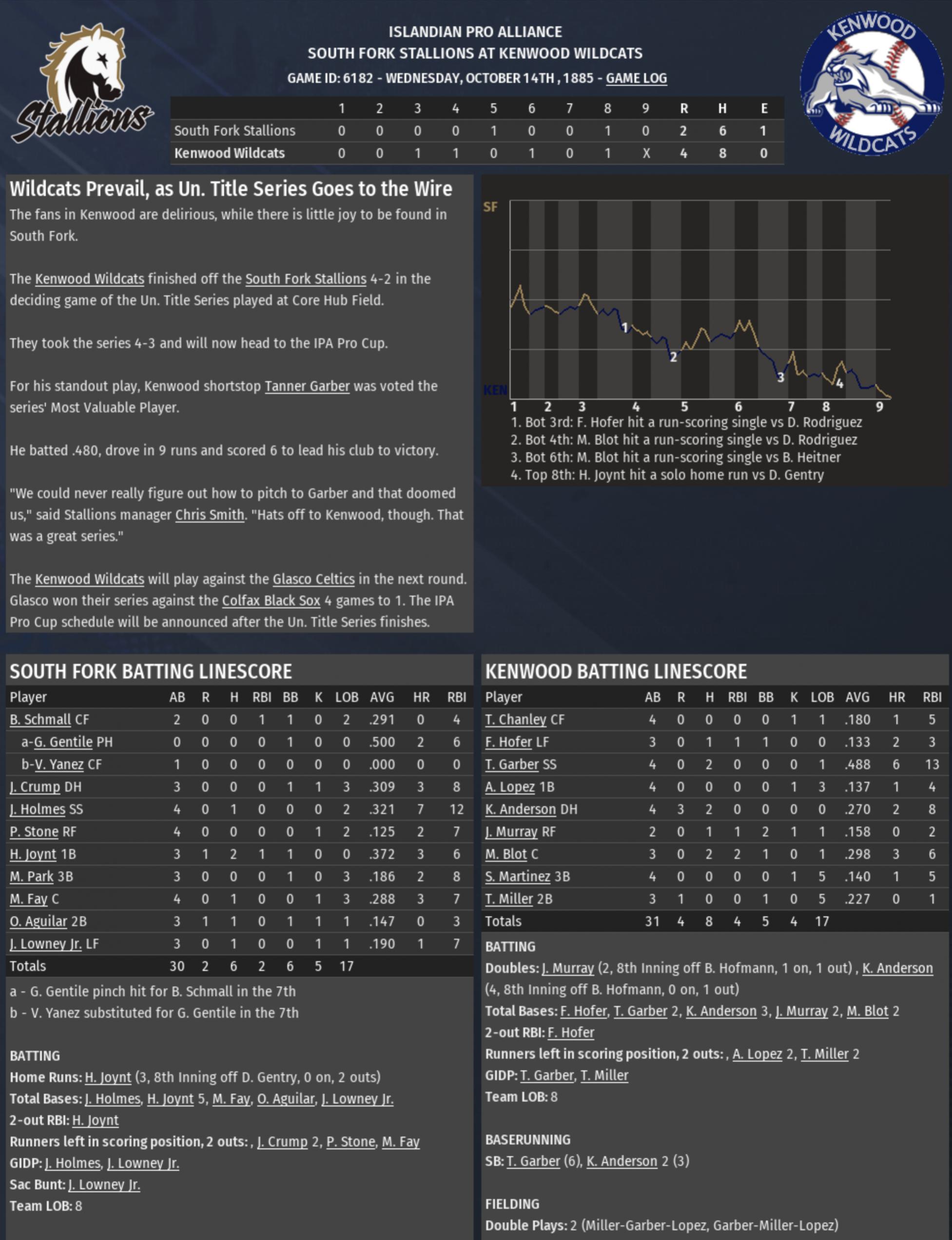 RU Title Series Glasco Celtics (108-54) vs. Colfax Black Sox (115-47) TU Title Series South Fork Stallions (108-54) vs. Kenwood Wildcats (111-51) |