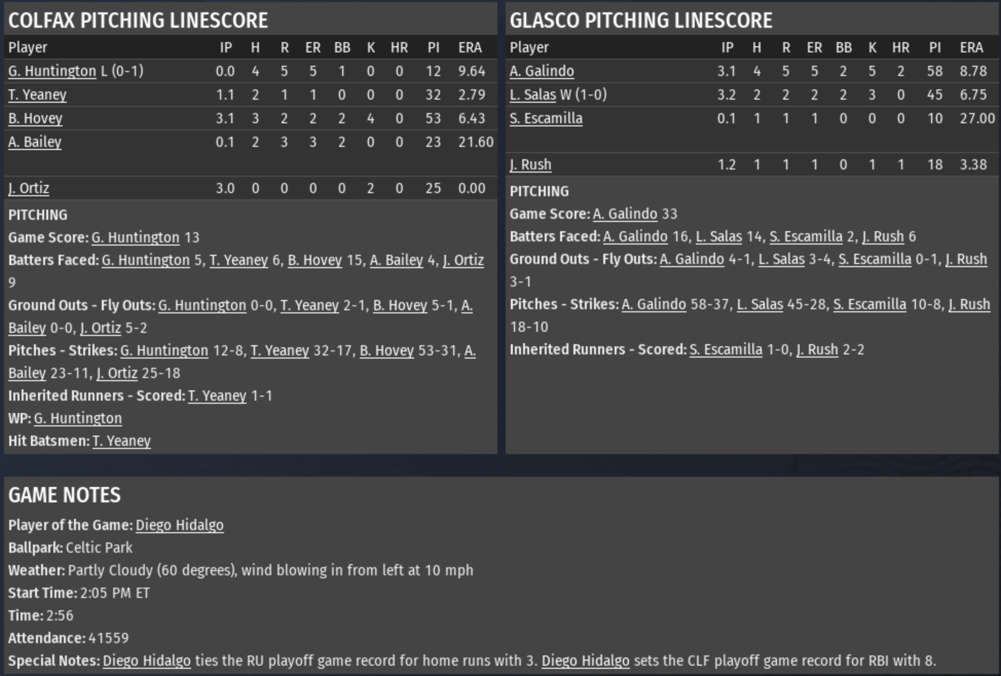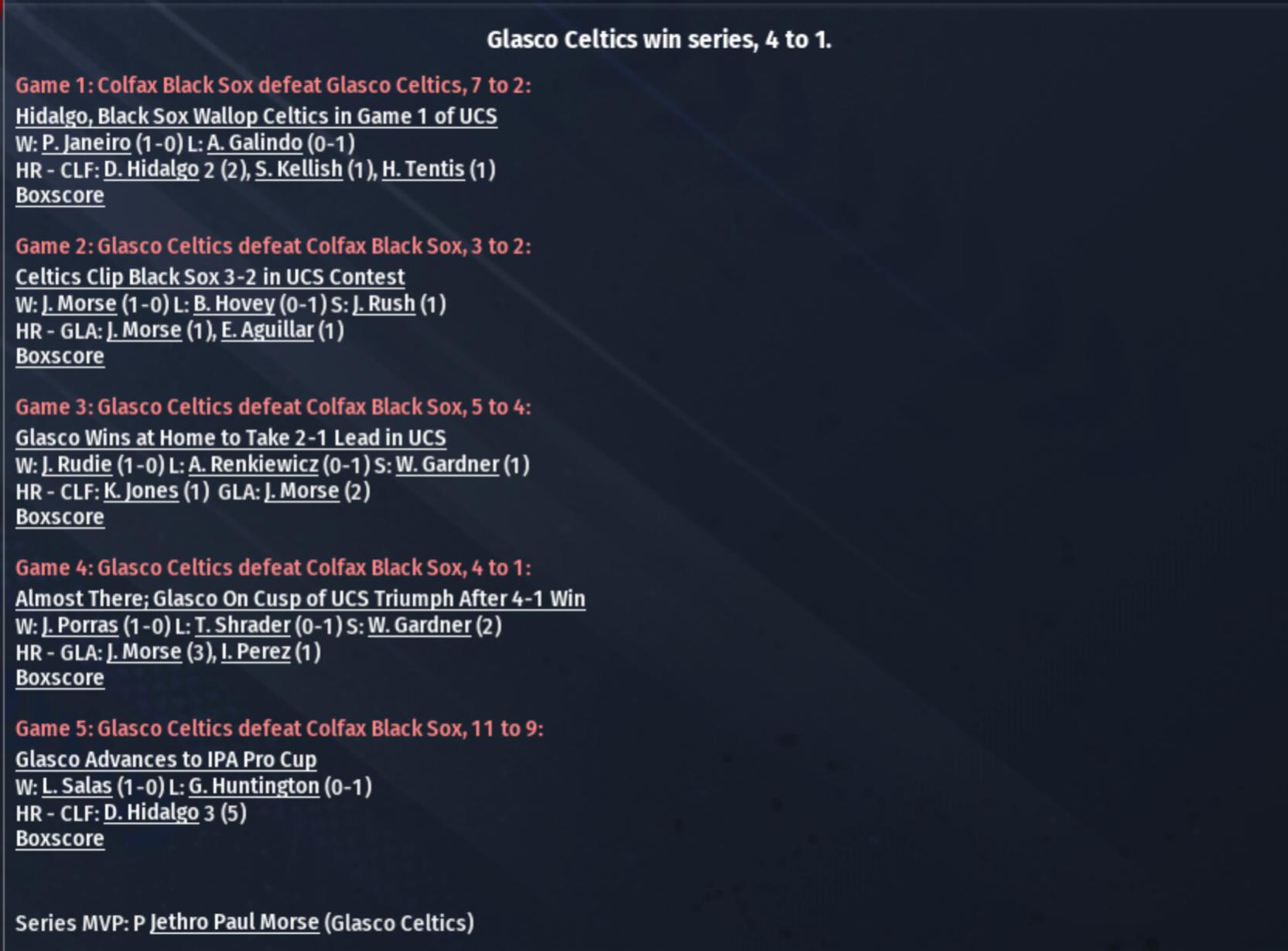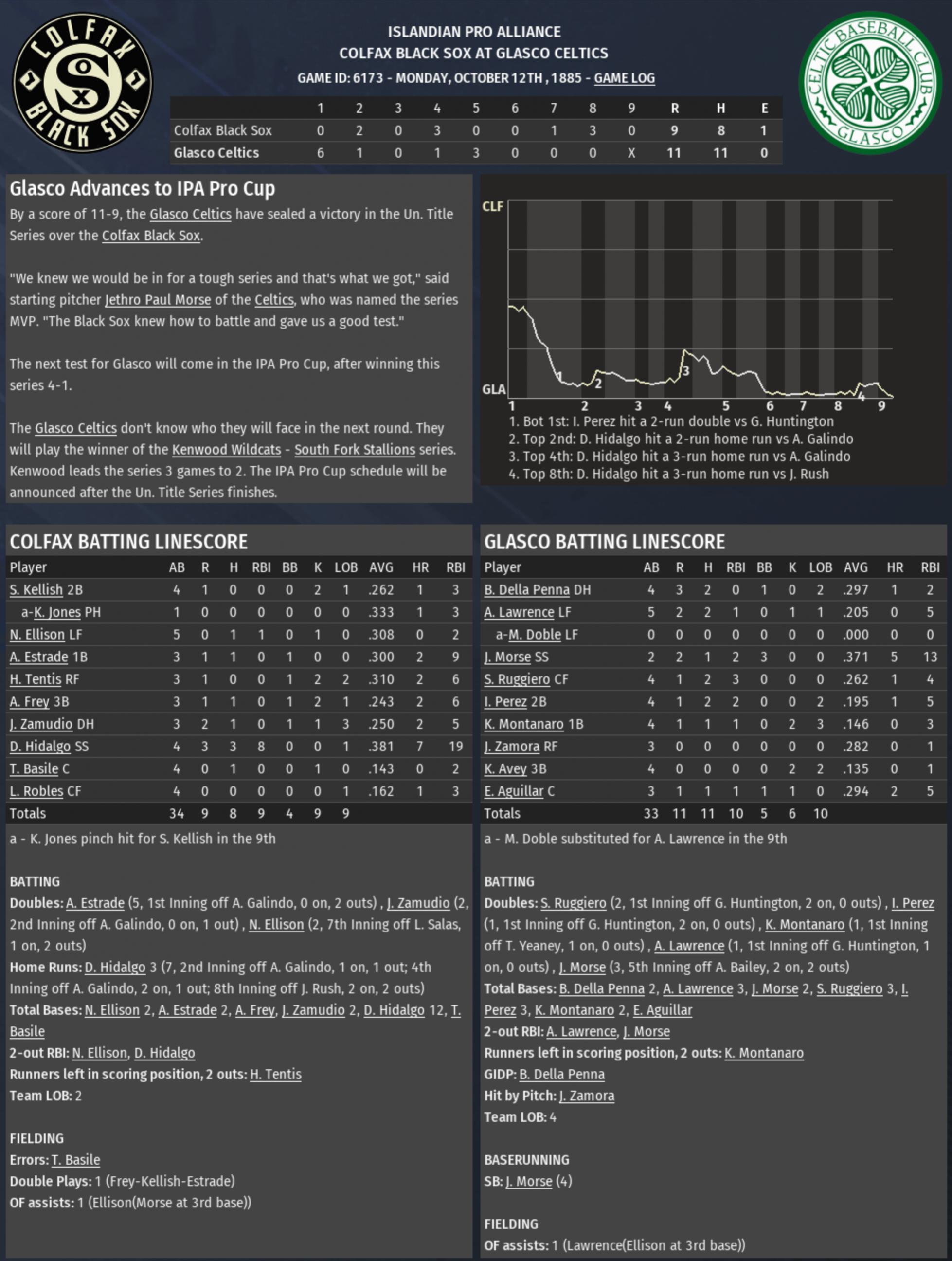 For the 2nd straight year, Glasco has defeated Colfax in the RU Title Series, and the Celtics are going back to the Pro Cup. It's Glasco's 3rd pennant, and they are looking to win their 2nd IPA title. Their lone championship came six years ago in 1879. |