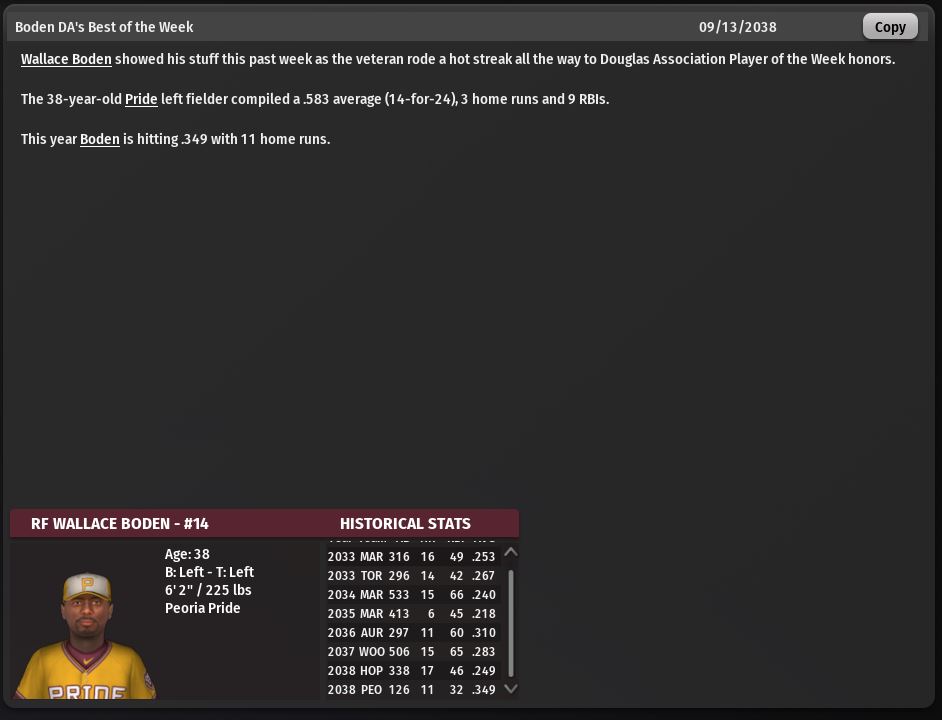 We struggled vs Willowbrook but played great vs Pontiac. While we were tied with GC briefly, we have extended our division lead back to 1½ games. We host To Kieren for 3, that could be a tough series then after a day off we host Madison for 3 and that hopefully will be an easy series. Tigris is back and Eloy was sent back to Middleton. Eloy might be back after the Middleton playoff run is over. With Fung out for the season, i called up P Stanford Murdick, who for now will pitch out of the pen but if we clinch he will start a game. I would like to see Murdick as our #5 next year but he has to prove that he can get the job done. Thus far he hasn't. Good week: Cedomil Hopewell Nicky T Eidsvag Collier Juan Wiley Sanchez Nunez Lysne Allen Ghetto H-Ram Apela