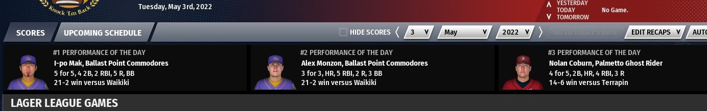 Gold beer award: Shane Lunday of Texas Leaguer Chin Music - Lunday went 4-for-5 with 2 home runs, 2 RBIs and 4 runs scored in a 14-11 loss to Meadowlark Mob Barley Silver beer award: Bobby Berndt of Goose Island Goslings - Berndt went 2-for-2 with a double, a home run, 3 RBIs and 4 runs scored in a 7-2 win over Twisted X Chupahopra Bronze beer award: Dale Beauvais of Toboggan Lunatic Fridge - Beauvais went 3-for-4 with 2 home runs, 3 RBIs and 3 runs scored in a 9-4 win over Thimble Island Kraken other scores from around the league: -Big Sky Trout Slayer get a grand slam in the top of the 9th to defeat Great Raft Reasonably Corrupt 5-3 -Laughing Sun Red Dwarf defeat Foulmouthed Malcontent 7-3 -Daft Badger Hoppypotamus defeat Horsefly Jazzy Razzy 3-2 -Firefly Hollow Dire Chinchilla defeat Waikiki Ala Moana 11-3 -Weyerbacher Blithering Idiot defeat Boulder Killer Penguin 4-2 -Tattered Flag Man of War defeat Prairie Sun Mad Hopper 7-6 -Palmetto Ghost Rider defeat Chafunkta Kingfish 3-2 -Crooked Crab Furious George defeat Kona Pipeline 3-2 -Smog City Sabre Toothed Squirrels defeat Terrapin Hopsecutioner 5-2 -Stony Creek Crankenstein defeat Odious Cellars Rubied Perspective 8-3 -Russian River Blind Pig defeat Funky Buddha Huki Idol 4-3 -Three Floyds Apocalypse Cow defeat Red Rock Elephino 7-2 -Jester King Das Wunderkind defeat Rabid Dwarves of Doom 3-2 in 11 innings -Four Hands Typhon defeat Sleeping Giant Beaver Duck 7-2 -Ballast Point Commodores defeat Mispillion River Space Otters 4-1 -Sierra Nevada Narwhals defeat Tree House Tornado 5-1 -Scorched Earth Giant Killer defeat Charleville Half Wits 11-1 |