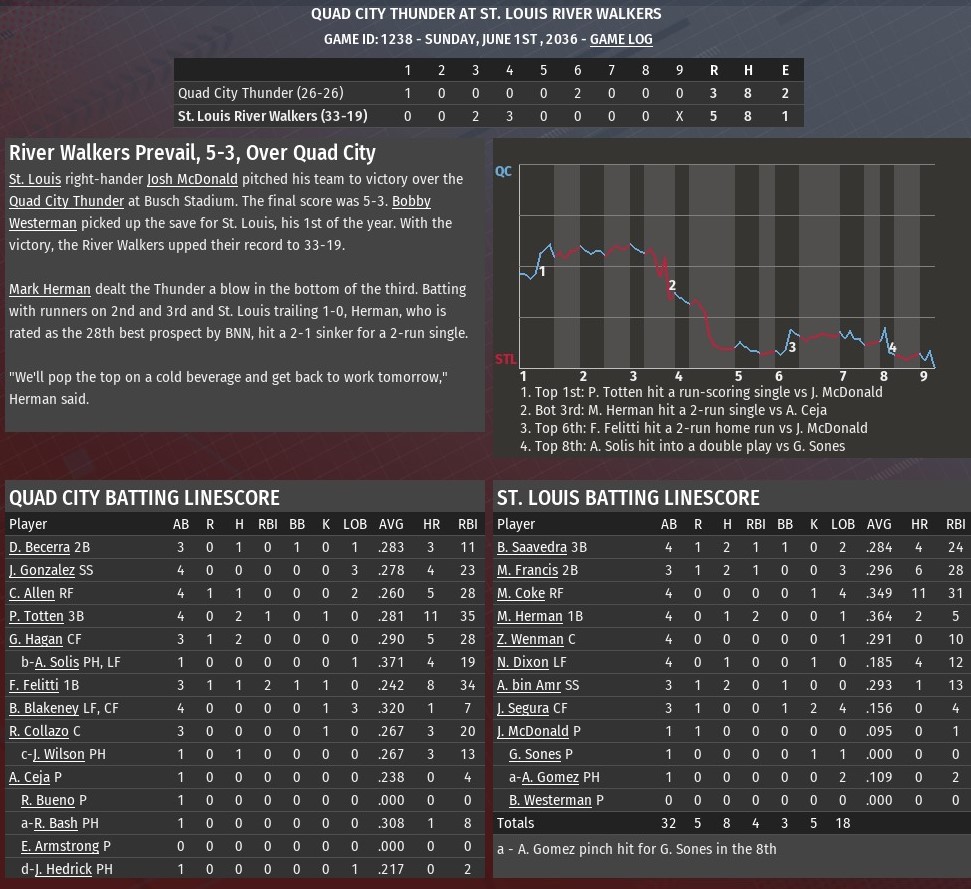 Down 1-0, St. Louis scored a pair of runs in the third inning and three more in the fourth and held on to defeat Quad City 5-3 at Busch Stadium (2006). The River Walkers won the final two games of their three-game series against the Thunder. Rookie Mark Herman drove in both third-inning runs with a two-out single off QC starting pitcher Antonio Ceja. A pair of errors by the Thunder played into St. Louis' outburst in the fourth. Ceja committed the first error on a ball hit by pitcher Josh McDonald. The first error came by Thunder third baseman Paul Totten on a ball hit by Abdul-Nasser bin Amr, allowing him to reach with one out. After a walk to Jose Segura, pitcher Josh McDonald reached on an error by QC starting pitcher Antonio Ceja, with bin Amr scoring on the play. Bob Saavedra followed with a single to score Segura. Marcos Francis made it 5-1 with a deep fly ball to right, with McDonald crossing the plate. McDonald (6-2) lasted 5.1 innings, allowing three runs on six hits. Greg Sones worked 2.2 innings, keeping the score at 5-3. Bobby Westerman posted his first save of the season with a scoreless ninth. |
