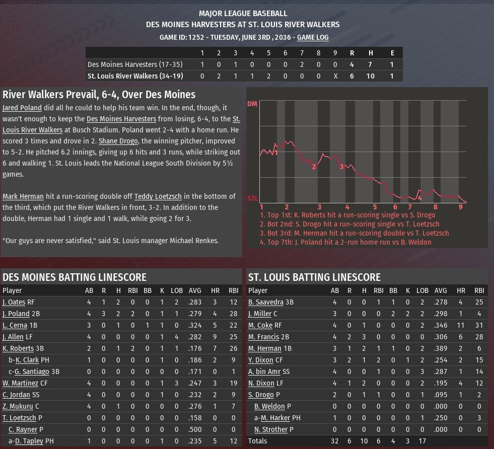 Tied 2-2, St. Louis scored one run in the third and fourth innings, and two in the fifth on its way to a 6-4 win over Des Moines in the opening game of a doubleheader at Busch Stadium (2006). The Harvesters' Jared Poland had led off the top of the third inning with a single off River Walkers starting pitcher Shane Drogo, and later scored when Joe Allen hit into a fielder's choice to tie it at 2-2. St. Louis reclaimed the lead in the bottom of the third with back-to-back two-out doubles from Marcos Francis and rookie Mark Herman off Harvesters starting pitcher Teddy Loetzch. An inning later, the Walkers pushed their lead to 4-2. Nathaniel Dixon led off with a single. Dixon stole second and moved to third on a Drogo bunt. Bob Saavedra then drove him in with a ground out. St. Louis added two more runs in the fifth. Yan C. Dixon drove in Herman, who had drawn a one-out walk, with a double of Loetzch. Abdul-Nasser bin Amr later scored Dixon when he grounded out off Clyde Rayner. A two-run homer from Poland off Brennan Weldon, who had just placed Drogo two outs in the seventh, made it 6-4. That, however, was the end of the scoring. Drogo (5-2) went 6.2 innings, allowing three runs on six hits. He struck out six and walked one. Weldon settled down after the Poland homer and retired the next four batters he faced. Nick Strother set Des Moines down in order in the ninth for his eighth save. |