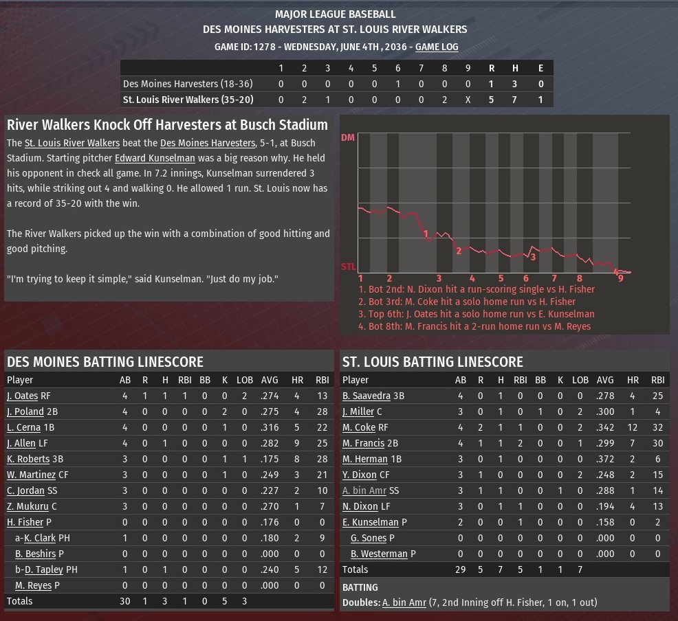 Edward Kunselman allowed one run on three hits over the first 7.2 innings, and St. Louis defeated Des Moines 5-1 at Busch Stadium (2006). The win gave the River Walkers' in two of the three games in the series. Kunselman (4-0) didn't allow a hit until Joe Allen singled with two outs in the top of the fourth inning. The Harvesters got their lone run on a home run by Justin Oates in the top of the sixth. It made the score 3-1. Kunselman exited after allowing a two-out double to David Tapley in the top of the eighth. Kunselman struck out four and didn't issue a walk. Greg Sones took over and got Oates to fly out to end the inning and keep the scoring at 3-1. Bobby Westerman set Des Moines down in order in the ninth. St. Louis went up 2-0 in the bottom of the second against Des Moines starter Hugh Fisher. Rookie Mark Herman was hit by a pitch to lead off the inning. Herman was eliminated when Yan C. Dixon hit into a fielder's choice. Abdul-Nasser bin Amr followed with a double, moving Dixon to third. Dixon scored on a single by Nathaniel Dixon. Kunselman then got down a bunt which scored bin Amr. A Manuel Coke homer off Fisher to lead off the bottom of the third made it 3-0. The Walkers got their final runs in the bottom of the eighth on Marcos Francis' seventh home run of the season. Reliever Mario Reyes served up the homer. |