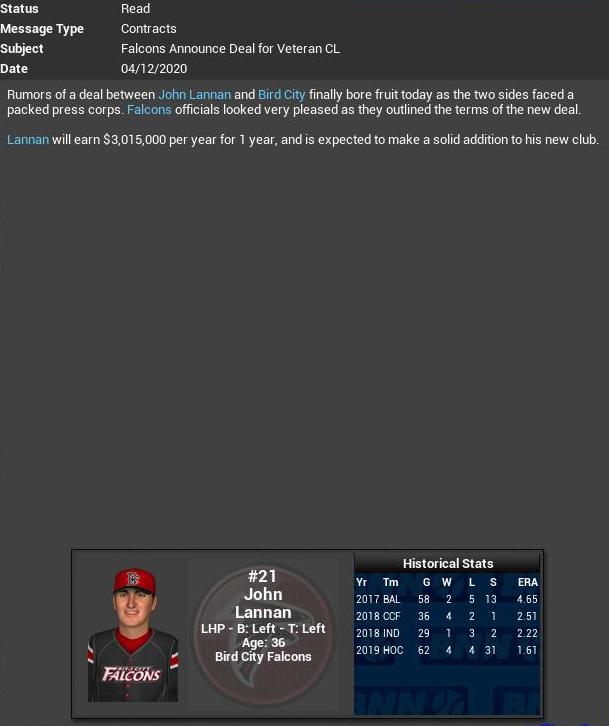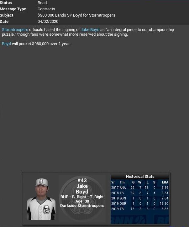 Darkside signs RHP Jake Boyd to a 1 yr deal. Isotopes claim IF Daniel Arcila from Ford. Okiyo Toyata threw a Perfect Game. It is the 3rd Perfecto since 2010. It is Toyata's 2nd no-hitter. Red Sox sign CL Pedro Rodriguez to a 1 yr deal.