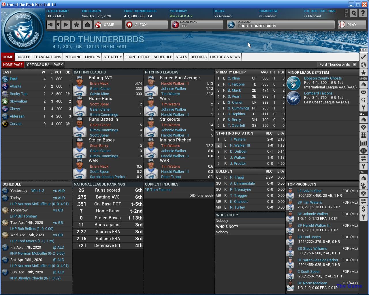 3 games vs Royals. Home opener. The Thunderdome is mostly ready. The hotel is not done, the roof is stuck open and we are missing 500 seats. We have plenty of beer, The field looks good. Thr Royals will be a great test of how good we might be. I have them finishing 2nd at around 95 wins. Some good veterans on this team. McDuffie Sr, M. Sieb, All, Johnson, Zucker.