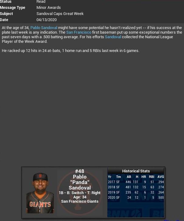 Atlanta Braves J.R. Graham gets a CG SH. Kevie Oko hits his 500th HR. He joins Rick Baker (628) & Jimmy Dugan (503) in the 500 HR Club. Panda is named MLB NL POTW. Sharks 3B Jussim is named AL POTW,.
