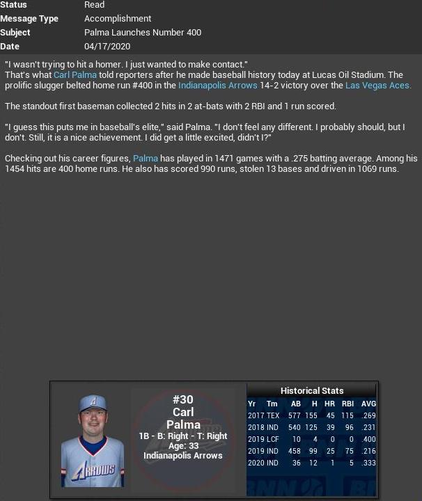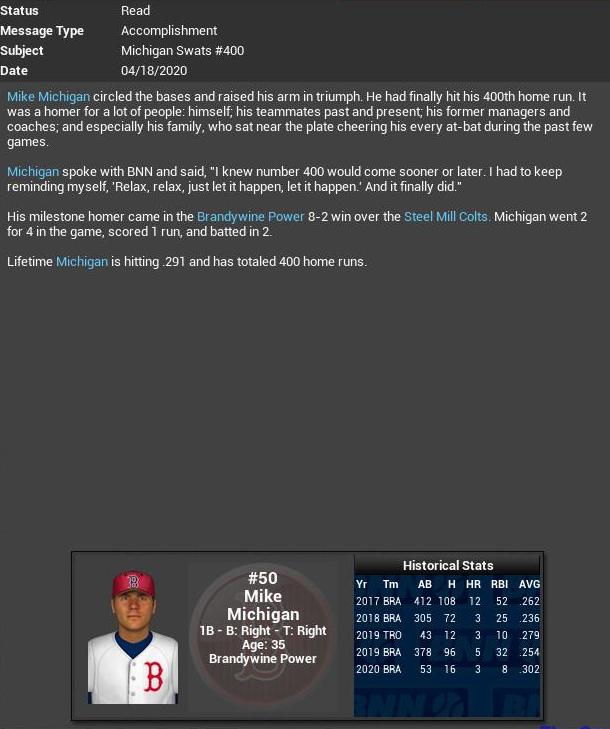 My cousin Carl gets his 400th HR. Way to go. Power 1B Mike Michigan gets his 400th HR. He is the only Power player left who started in 2003. Power LF Nikezic retires. Twins Antonio Cruz gets a CG SH.