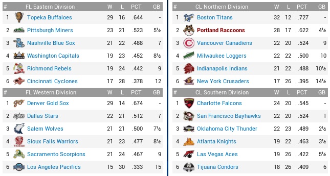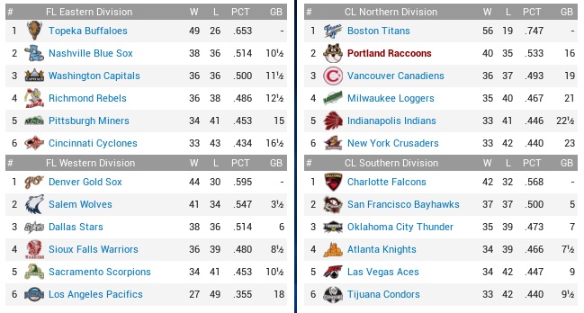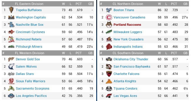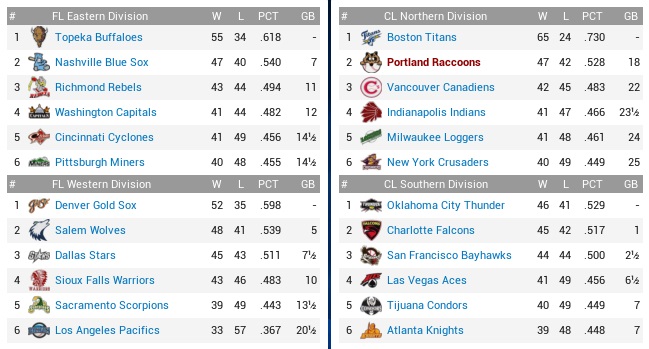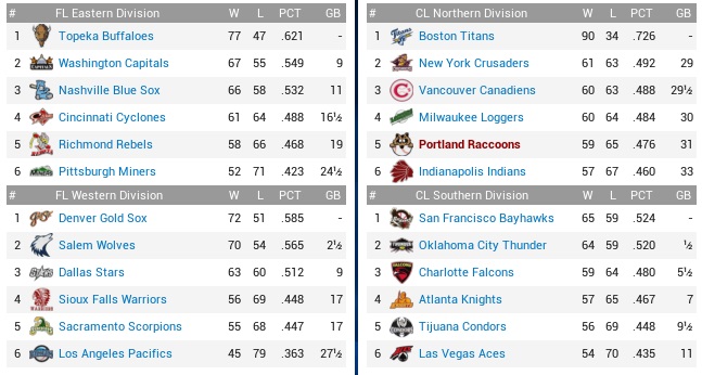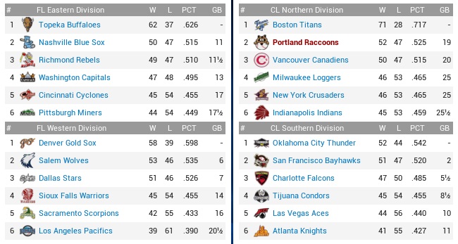 The Raccoons’ 4-game winning streak would meet up with the Falcons’ 6-game losing streak to see whether both teams had the guts to go on. If they weren’t disintegrating violently, the Falcons knew how to bat, ranking second with a .270 average, and third with 430 runs scored, outscoring us by 35 markers, and they were at least tied for fourth (with the Coons!) with 398 runs allowed. Projected matchups: Ralph Ford (5-10, 4.26 ERA) vs. Miguel Diaz (8-9, 4.37 ERA) Edgar Amador (7-4, 3.30 ERA) vs. Frank Pierre (10-8, 3.70 ERA) Nick Brown (14-3, 2.88 ERA) vs. Dylan Jones (8-6, 4.21 ERA) After Diaz, and starting with Pierre, whom the Falcons just on Monday acquired from the Condors for Toby McGreary (.308, 3 HR, 31 RBI), we will be served two left-handers, and the possibility for a third one to start the following series is high. The Coons vs. left-handed pitching? Uh-oh. Game 1 POR: SS Guerin – CF Torrez – 3B Sharp – 1B Martin – 2B Ingall – RF Brady – C Wood – LF Tyler – P Ford CHA: 2B Heffer – 3B Whaley – CF Burke – 1B H. Green – LF Estrada – SS Vieitas – C E. Durango – RF Correja – P M. Diaz Three Coons got on, three Coons brought them in, and we were up 3-0 in a hurry. By the second inning, the Raccoons’ offense was in refusal mode, not even scoring runs when the Falcons were begging them with errors and hit batters like in the top 3rd, Ralph Ford showed to be easily hittable, and Eddie Torrez had been lost to injury. The Ford thing was most unnerving right now. There were constantly Falcons on base, and sometimes you thought there even Falcons on base when the Raccoons were batting. Well, it couldn’t be Coons, because for all practical purposes the Coons ticked all boxes for being legally deceased from the second through the sixth inning. All of a sudden in the top 7th, Martin and Ingall erupted to hit back-to-back home runs and run the score to 5-1. While the Falcons were indeed on base all the time and chased Ford after 6.1 laborious innings, they didn’t get the key hit, and their lone run scored on Pedro Estrada’s inside-the-park home run in the fourth. Ford willed them two base runners, which Manuel Martinez snuffed out quickly with strikeouts to Matt Whaley and Jake Burke. While the Falcons would get one run from Huerta in the eighth, they didn’t even get close to mounting an actual threat late in this one, and both decision streaks endured. 5-2 Raccoons. Ingall 3-4, HR, 2 RBI; Brady 2-3, BB, RBI; Brady now has two multi-hit games in the last six weeks. Yay! The injury to Torrez smells. I wanted to sit Brady against the left-handers, but now King has to cover center. Darwin Tyler doesn’t even hit the ball in any fashion, but before we make a roster move regarding him, we want to find out what is wrong with Torrez and whether he will have to be put down. Game 2 POR: SS Guerin – 2B Ingall – LF Reece – 1B Martin – 3B M. Ramirez – RF Brady – C Thomas – CF King – P Amador CHA: 2B H. Green – LF Estrada – C F. Chavez – CF Burke – 1B J. Mendoza – SS Vieitas – 3B Moore – RF Warner – P Pierre The Coons again put three on in the first inning before Ramirez hit into a killing double play. The top 2nd then saw a major spot develop on the vest of the Falcons’ new acquisition. Brady, Thomas, and King reached by various means to load them with no outs, with Amador then lifting a fly to right for a sac fly. Guerin then grounded hard to Herberto Vieitas, by all estimated the end of the inning, except that Vieitas dropped the ball and all hands were safe. From here, another five runs scored when Ingall walked, Reece hit a sac fly, and Martin hit one entirely out of the park. Reece singled home Ingall in the fourth inning, which only then had Pierre see his Falcons debut end, and at 7-0 we were comfortably ahead. Or maybe not. Amador surrendered contact the whole game, and it was not good contact if it’s your pitcher. The Falcons got him for two in the fifth, but we were still up 7-2. Then Amador didn’t get anybody in the bottom 6th, three up, three on. 7-3, runners on first and second, Moreno came on, with the middle infielders twice not turning a double play, and then Moreno surrendering some contact to get yanked. Nordahl allowed an RBI single to Estrada that romped the score to 7-6 before Chavez struck out to end a most dismal 4-run inning. It wasn’t over, though, because Nordahl walked two in the bottom 7th to be yanked himself with two out. We brought Williams, they brought Whaley, and the ex-Indians singled to tie the game. Corkum bloked up a leadoff triple to Hubert Green in the eighth, and that was that. 8-7 Falcons. Ingall 2-4, BB, 3B, RBI; Reece 2-4, RBI; Martin 3-5, HR, 3 RBI; King 3-4, 2B; Up by seven with 15 outs to collect. No, there is no complicated explanation for it. They just straight suck. They just ****ING SUCK. We haven’t traded away everything that didn’t have 10/5 rights in a while. Might be time soon. Can’t stand a lot of sorry faces around here anymore. Game 3 POR: SS Guerin – 3B Sharp – 2B Ingall – 1B Martin – LF Reece – RF Brady – C Wood – CF King – P Brown CHA: 2B Heffer – 3B Whaley – CF Burke – 1B H. Green – LF Estrada – SS Vieitas – C E. Durango – RF Correja – P D. Jones Everything was falling to pieces in a hurry in this game. While Brown knocked in the first run of the game with a funny double in the top 2nd, he did not get out of the bottom 2nd. Hubert Green hit a bloop single before Brown walked the bases full, then hit Durango to tie the game. Correja singled, 2-1. The pitcher struck out, before Brown also plunked Dave Heffer. Whaley walked, 4-1, and another run scored on Burke’s groundout, before Green hit another single to score Heffer. When Estrada walked, Brown was grabbed and thrown under a bus. I didn’t realize much of the remaining seven innings, crying furiously in the corner of my box. Let’s shorten the bad news section by say