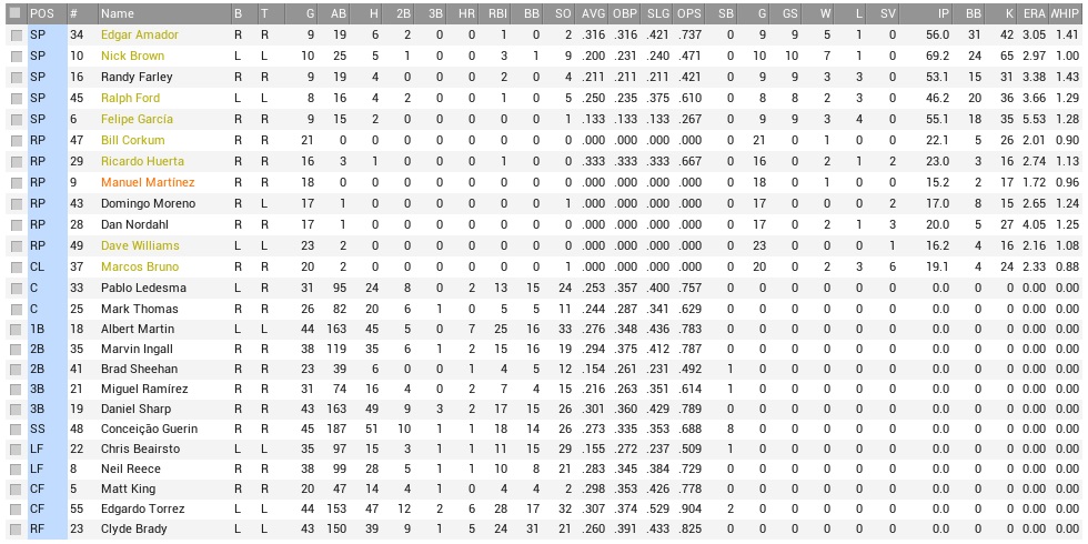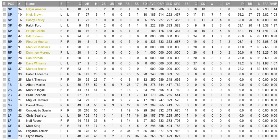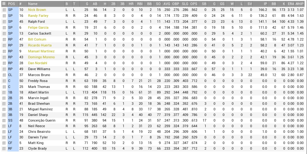 Danny Sharp enters the week with a 12-game hitting streak in place. Raccoons (55-50) @ Condors (46-59) – August 2-4, 2004 While the Condors were fifth in runs scored and generally capable of hurting opposing pitchers, their own pitching staff was kind of a bottomless well, as they conceded the second-most runs in the league. Horrible defense also had a hand in their struggles. Projected matchups: Edgar Amador (7-4, 3.48 ERA) vs. Jose Aguilar (1-12, 5.91 ERA) Nick Brown (14-4, 3.21 ERA) vs. Brian Patrick (1-4, 5.75 ERA) Randy Farley (5-10, 4.70 ERA) vs. Kelvin Yates (6-11, 3.51 ERA) We will do good to keep our head above water in this series, because after that we play four with the Titans. These three pitchers are all right-handed. Yates leads the Continental League in strikeouts. Game 1 POR: SS Guerin – 3B Sharp – LF Reece – 1B Martin – 2B Ingall – RF Brady – CF Tyler – C Rosa – P Amador TIJ: SS Heathershaw – C Cicalina – CF R. Perez – LF Luxton – 1B B. Boyle – RF J. Thomas – 3B N. Chavez – 2B McGreary – P J. Aguilar And the week started with one of those games that just kicked you in the guts, sent you to the floor, and when you were rolling and wincing, here comes a kick in the stomach. Amador pitched two innings, then left with an injury, while the Raccoons left a few runners wherever they chose to. The bottom 3rd saw Bill Corkum rocked for three runs, but most blame was on a capital dork move by Darwin Tyler in centerfield, allowing Ramón Perez a 2-out, 2-run double on a ball that could easily have been a single, and no runs, and Tyler, the dork, wasn’t even charged an error. The mess didn’t get any less awful from here. Moreno just didn’t retire anybody and was charged four runs between the fifth and sixth innings, with Freddy Rosa making a terrible throwing error on a stolen base attempt. Jose Aguilar, who had won ONE game all year long, cruised through seven, and when Albert Martin did hit a 3-run home run in the eighth, it was way too late, and way too little. 8-3 Condors. Guerin 2-3, BB; Sharp 2-4; Thomas (PH) 1-1; Love (PH) 1-1; Game 2 POR: SS Guerin – 3B Sharp – LF Reece – 1B Martin – 2B Ingall – RF Brady – C M. Thomas – CF King – P Brown TIJ: CF R. Perez – 2B B. Boyle – C Cicalina – RF Luxton – 1B Heathershaw – SS McGreary – LF J. Thomas – 3B Stein – P Patrick Good news were that Brownie registered the first seven outs with strikeouts. Bad news were that the Condors scored two runs on three hits in the bottom 1st anyway, driven in by Bradley Heathershaw. The Coons had about nothing going for them for their first 17 outs. Martin doubled with two out in the sixth, their first runner in a few innings. From here, Ingall singled, Brady singled, plating Martin, and Thomas drew a walk. That brought up King with the bases loaded, down 2-1, and the count ran full. Matt King for once didn’t flunk out, and hit a single to left to plate two runs and flip the score to 3-2 in favor of Brown, who was up next and blooped a single to shallow center to score Thomas and it was 4-2. Guerin struck out, ending a streak of six straight runners that had created some terrific 2-out terror. Brown delivered a shutdown inning, striking out McGreary to reach ten K’s on the day, and he got pinch-hitter Luis Reya for his 11th to end a perfect seventh, but he had now over 100 pitches on his odometer, and we had very little bullpen to work with. But maybe he had another one or two outs in him. Brown batted with runners on the corners and one out in the eighth, and singled through the venerable Jim Stein to score the team’s fifth run. Guerin struck out again on a rotten day, but Sharp went from 0-4 to a 14-game hitting streak with an RBI single that plated King, 6-2. Brown was squeezed dry in the bottom 8th, which he completed despite plunking Cicalina with two outs. Clyde Brady made a strong catch on Robbie Luxton’s drive to right, and Brown got through eight with a dozen strikeouts. And yet, it was all about to go up in flames. Huerta couldn’t finish the bottom 9th, and put McGreary on base. With two outs, Williams replaced him, but walked the bases full. We had to get out Marcos Bruno with the tying run at the plate in Ramón Perez. Bruno fell to 3-1 before Perez sent a drive to left, and while the less confident souls around fainted, Neil Reece wrung the last bit of ooze from his old, wretched body and intercepted the drive to end the game. 6-2 Coons. Martin 4-5, 2B; Brady 2-4, BB, RBI; Thomas 3-4, BB; Brown 8.0 IP, 5 H, 2 R, 2 ER, 1 BB, 12 K, W (15-4) and 2-4, 2 RBI; To be honest, I didn’t faint in the ninth, I fainted in the first. Now off to Randy, who, if he doesn’t take victory in this game, will have gone TWO MONTHS without a W. Game 3 POR: SS Guerin – 3B Sharp – 2B Ingall – 1B Martin – RF M. Ramirez – C M. Thomas – LF Tyler – CF King – P Farley TIJ: SS McGreary – C Cicalina – CF R. Perez – LF Luxton – 2B B. Boyle – RF J. Thomas – 1B Cambria – 3B N. Chavez – P Yates A Perez single, a stolen base, another single, and the Condors were up 1-0 in the first. By contrast in the top half of the third inning, the Raccoons turned King getting on, stealing second base, with no outs, into a bad bunt and an out at third base and a double play. Farley turned out to have nothing at all and managed to get to two full winless months with ease, being laden with five runs over 5.1 innings. It wasn’t all his fault. Part of the issue was the Raccoons not scoring anything anyway. If your team nets you zero runs, it’s hard to win, logically. They had the bases loaded with one out in the third, didn’t score, and then didn’t even come close against Yates. In the eighth, the Condors doubled their output against Corkum, who did not get a strike past any of the four batters he faced, and Nordahl. The Raccoons managed two hits (none by Sharp) in a fantastic smothering. 10-0 Condors. For additional del