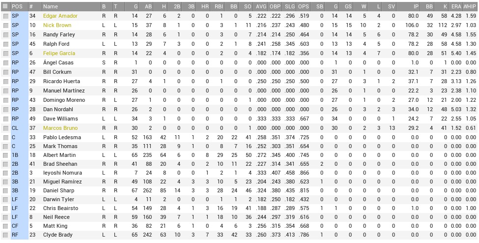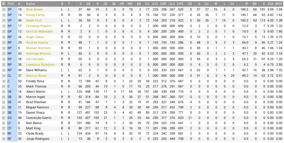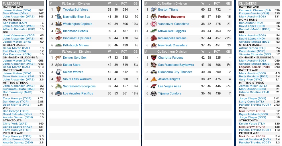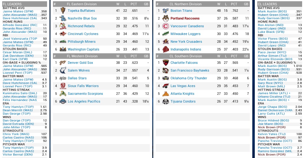 While the Raccoons were on the way down, the Stars were on the way up, being 9-2 in June. Combined with their most runs scored in the Federal League, the Raccoons were probably in for another pelting, having lost their last four games. But hey, we’re gonna have Brownie! All we ever need is Brownie! Projected matchups: Nick Brown (8-2, 2.96 ERA) vs. Juan Santana (2-3, 4.89 ERA) Randy Farley (5-5, 4.30 ERA) vs. Elwood Spurrell (4-7, 5.74 ERA) Ralph Ford (4-4, 3.89 ERA) vs. Veit Koell (4-6, 3.10 ERA) That’s three right-handed pitchers. Whether that is a good or a bad thing with Torrez out (and not diagnosed) will have to be found out. All we know is that Martin and Brady aren’t hitting either… Game 1 POR: RF Brady – 3B Sharp – LF Reece – 1B Martin – C Ledesma – CF Beairsto – 2B Nomura – SS Sheehan – P Brown DAL: SS K. Sato – 2B H. Garcia – RF T. Austin – 1B R. Perez – 3B Cavalleri – C P. Fernandez – LF M. Smith – CF Cowan – P Santana Turns out, we didn’t even had Brownie. All we ever needed, was just not there. While he struck out four in a row between the first two innings, and got three runs of support in the top 2nd when Brady tripled in a pair and scored on Sharp’s single, Brown was whacked in the bottom 3rd, in which the Stars took all the pretty runs right back and tied the score at three. He didn’t walk batters, but he was whacked. The Stars would continue to hit him quite good, as it seemed they adopted a strategy of rip-and-hope-for-contact. They also struck out nine times in seven innings, after which Brown was in the lead by the slimmest of margins, 4-3, with the run driven in by Beairsto in the fifth. We did get some major breathing space however in the eighth. Nomura singled off ex-Coon Gabby De La Rosa, and Miguel Ramirez hit for Brown, and assaulted Gabby with a cannon shot out of right center. Bottom 8th, Martinez and Williams each allowed a single that put runners on the corners, which Marcos Bruno was tasked with removing early to get a 4-out save. Now, before the bottom 8th we had removed Martin, moving Sharp to first and Ramirez stayed in at third. Martin’s spot was due up first in the ninth, however. When Bruno came in, another double switch removed Reece and put Beairsto in left. That probably saved the game, because Beairsto made a strong play on a howling line drive by Ramiro Gonzalez, who had much earlier replaced Vitantonio Cavalleri, who had blamed striking out against Brown on the umpire, and had done so for everyone to hear. Bruno’s ninth was uneventful and saved Brown’s ninth. 6-3 Raccoons. Sharp 3-4, BB, 2B, RBI; Reece 2-5; Ramirez (PH) 1-1, HR, 2 RBI; Brown 7.0 IP, 8 H, 3 R, 3 ER, 0 BB, 9 K, W (9-2) and 1-3; Bruno 1.1 IP, 0 H, 0 R, 0 BB, 1 K, SV (12); After hardly anything went right the last four games, this time at least the most important things went right. Game 2 POR: RF Brady – 3B Sharp – LF Reece – 1B Martin – C Ledesma – CF Beairsto – 2B Nomura – SS Sheehan – P Farley DAL: SS K. Sato – 2B H. Garcia – C R. Garza – LF R. Perez – 1B Barnes – RF A. Solís – 3B Cavalleri – CF Cowan – P Spurrell Vitantonio Cavalleri had been ejected the previous day, but was not denied this time, hitting a solo home run off Farley in his first plate appearance. Beairsto matched his output in the fifth, and that was all the scoring through five, although the Stars left plenty of men on against Mr. Singles. Mr. Singles then surrendered a double to Angel Solís, the one-time Elk, and walked Cavalleri to start the bottom 6th, and that quickly spiraled out of control. Moreno replaced Farley, but the Stars put up a 4-spot and that was enough to sink the team with Spurrell not being magnificient, but good enough to master what was left of our lineup, and he ended up whiffing nine. 6-1 Stars. Martin 2-4; We had nothing the entire day, and this is something that could be a more frequent occurrence down the road. Never mind all the injuries, Al Martin hasn’t hit a homer in weeks, no outfielder is producing, no catcher is producing. Danny Sharp is trotting along, and that is about it. Oh yeah, injuries. Eddie Torrez was finally diagnosed with a knee sprain. He will miss about ten more days, and that is enough to put him on the DL. One or two days extra aren’t gonna kill us twice over. We called up 22-year old Darwin Tyler, our 1999 first round pick, who was slugging .505 in AAA. The main issue is who will play center. Neither Beairsto nor Tyler have a lot of range, Reece doesn’t have any anymore, so Matt King might play regularly. But when Tyler is up, we want to play him… Ah, decisions. Game 3 POR: RF Brady – 3B Sharp – C Ledesma – 1B Martin – CF Beairsto – 2B Nomura – LF Tyler – SS Sheehan – P Ford DAL: SS K. Sato – 2B H. Garcia – RF T. Austin – 1B R. Perez – 3B Cavalleri – C P. Fernandez – LF M. Smith – CF Cowan – P Koell The Coons stormed out of the gate with a Brady single, Sharp hitting one up the left field line, Ledesma hitting one up the right field line – and then stopped at 2-0. For that inning at least. Sheehan got on in the second, stole second base, and then scored on a Brady single and subsequent Austin error. Sharp doubled in Brady, 4-0. In the top 3rd, Tim Austin robbed Martin of a homer, but couldn’t rob Beairsto of a single, and quickly the bases were loaded for Sheehan, who managed a sac fly, 5-0, and now it was Ford’s to blow, something that he instantly set out to do. Smith and Cowan singled to get the bottom 3rd started, Ford unraveled, walked Koell and Sato on eight pitches, and surrendered four runs in a gruesome, soul-killing inning. Another one of those was coming up right away. While Koell was removed after three, Ford was yanked in the fifth after short-time Coon Pablo Fernandez rocketed a go-ahead 3-run homer off him. The Raccoons weren’t even close to mounting a comeback rally, lacking any bite. 8-5 Stars. Brady 4-5, 2B, RBI;