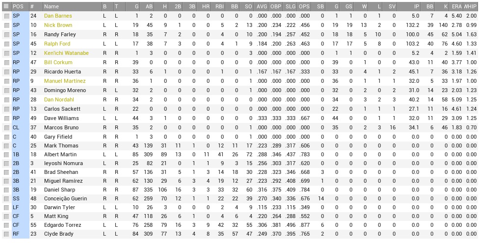 We start the last week before the All Star game. The Loggers were a shadow of their former self, not scoring runs (even less than the Coons), and also their pitching had kind of fallen apart completely. They were second-last in offense and seventh in pitching. They are our four-and-four partner this year around the All Star game, and so far we are up 3-1 in the season series. Projected matchups: Felipe Garcia (5-7, 5.05 ERA) vs. Jaime Aguila (2-10, 4.79 ERA) Nick Brown (12-2, 2.71 ERA) vs. William Lloyd (2-1, 4.32 ERA) Randy Farley (5-9, 4.72 ERA) vs. Dani Alvarado (6-7, 4.23 ERA) Ralph Ford (5-7, 4.80 ERA) vs. Ramiro Gonzalez (7-8, 3.97 ERA) Who are these guys and what are they doing in the majors?? All we know is that Lloyd and Gonzalez (well, we know Gonzalez) are left-handers. And we are not lucky to miss Martin Garcia, but he is on the DL. And boy, could they use him. Game 1 POR: RF Brady – 3B Sharp – CF Torrez – 1B Martin – C Ledesma – LF Reece – 2B Nomura – SS Sheehan – P F. Garcia MIL: 2B B. Hernandez – 3B M. Brown – RF Hiwalani – LF Graham – 1B M. Woods – SS T. Johnson – CF C. Ramirez – C Melendez – P Aguila And here is a pitcher that doesn’t get anything done, and the Raccoons are dazzled beyond belief. They wouldn’t do anything against Aguila, marveling at his ****ty dime-a-dozen stuff. Garcia meanwhile went 3.2 innings of no-hit ball before Dave Graham hobbled a single up the middle into center. In rapid succession Mac Woods singled and Johnson plated both with a double. Garcia’s little world hurriedly headed for total implosion, as the Loggers whacked him at will in the fifth inning. Corkum replaced him, but by then the score was 6-0 and the ship named Hope had long sailed. Corkum also gave up another run in the sixth, and then it was Neil Reece, the Sorry Specter From A Better Time, to actually do some damage with a solo homer off Aguila in the seventh. All too late, and by far not enough, though. 9-1 Loggers. Torrez 2-4, 2B; Reece 2-4, HR, RBI; For Garcia, this was the end. Enough sucking. Our AAA depth may be shallow, but so is he. We made a few roster moves before Tuesday, as both Garcia and Alejandro Rojas were demoted to AAA. In turn, Conceicao Guerin returned from his rehab assignment, while Marvin Ingall started a rehab assignment in St. Pete. We also added 33-year old Dan Barnes, the contents of a municipal trash bin in a suburban park, cast into pitcher’s form. Barnes pitched to an 8-ish ERA in St. Pete. He will get his two, three starts in July, suck balls tremendously, and will then be released, while I try to trade some unwanted catcher for a mediocre but proper back-end pitcher. We will also insert Kaz Kichida into a starter’s role in AAA. Yes, he sucked the air of the park as a reliever, no we’ll have him start! Because that’s how we roll, and how do YOU think a team can lose seven-going-on-eight consecutive seasons?? Game 2 POR: SS Guerin – RF Brady – 3B Sharp – 1B Martin – LF Reece – C Thomas – CF King – 2B Sheehan – P N. Brown MIL: 2B B. Hernandez – RF Fletcher – LF Hiwalani – 1B M. Woods – SS T. Johnson – 3B Tolwith – CF K. Wood – C Melendez – P Lloyd After going down in order in the first, the Raccoons jumped on Lloyd in the second inning. Martin led off with a double, and Reece and Thomas added singles to get the line moving. Sheehan and Guerin would also hit singles to plate a total of four runs in the inning. Under normal circumstances ample support for a certain pitcher who led the league in wins and was pretty darn close in strikeouts and ERA. It would not be an easy cruise for Brownie, however, and the Loggers put Ken Wood and Ruben Melendez on to start the bottom 3rd, and also brought them in to score to cut the lead in half. The Coons had their chances to increase their bid again, but f.e. in the fifth had Sharp and Martin in scoring position with no outs and didn’t score. In the sixth they would add a run, with the runner (Sheehan) reaching after being drilled. Brown’s stuff was lacking against a fully right-handed lineup and he struck out only five before retiring after seven innings on 90 pitches, but the 5-2 lead was still sound. Then we did something we hadn’t done in a while. We trusted Dan Nordahl with a lead and he made it through an inning without shattering Brown’s thirteenth to bits. Jerry Fletcher hit a leadoff double off Bruno in the ninth, but while he came in to score eventually on Woods’ groundout, that was all the Loggers got. 5-3 Raccoons. Guerin 2-4, 2 RBI; Martin 3-4, 3 2B; Reece 2-4; Sheehan 2-3, 2B, RBI; Brown 7.0 IP, 4 H, 2 R, 2 ER, 1 BB, 5 K, W (13-2); Brownie has now won six straight, and 13 of his last 15 after going 0-1 in the first three starts of the year. The exceptions in the streak came back to back after seven straight wins, first a no-decision against the Bayhawks, then that dismal 6-1 loss where the Crusaders piled fudge on him. Odd: all of Brownie’s runs this year have been earned. Game 3 POR: SS Guerin – CF Torrez – 3B Sharp – 1B Martin – RF Brady – LF Reece – C Ledesma – 2B Nomura – P Farley MIL: 3B M. Brown – CF Fletcher – RF Hiwalani – 1B M. Woods – SS T. Johnson – 2B Tolwith – LF J.J. Villa – C Melendez – P Alvarado The Coons had had a 4-run second inning the previous day, the Loggers matched them this time, putting their first six batters in the second inning on base before Fletcher hit into a double play. Otherwise they might well have piled 28 runs on Farley, who continued to be utter dog ****. Like the previous day, the other team scored two in return, here with Al Martin’s 2-run homer, but the Loggers kept piling. They were robbed of a score in the fourth by Brady’s strong catch in right on Tom Johnson’s fly that would have plated two, but ended the inning, but in the fifth, with Villa on base, Farley walked Dani Alvarado, and it was ENOUGH. Out with the carcass, in with Willi