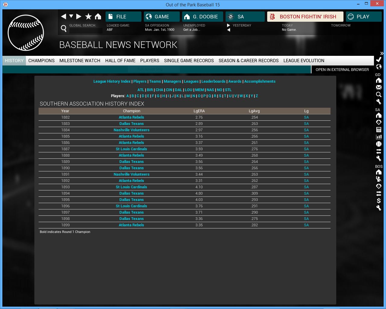The 8 North League teams will be: Boston Americans (Fightin' Irish) Brooklyn Robins Chicago Fire Cleveland Spiders Detroit Wolverines New York Knights (Yankees) new owner John D Rockefeller Philadelphia Liberty Washington Senators (Nationals) The South League teams will be: Charleston Generals Cincinnati Redlegs Georgia Peaches (Atlanta Rebels) Houston Texans (Dallas Texans) Louisville Colonels Nashville Vols (Volunteers) St Louis Cardinals Texas Rangers (Memphis Blues) new owner Andrew Carnegie Baltimore Orioles, Pittsburgh Burghers, Milwaukee Grays, St Louis Browns, New Orleans Pelicans & Birmingham Barons will fold. A redraft of all players will take place. A draft lottery took place which will determine who will pick where. Charleston has the #1 pick. All rounds will follow this order.