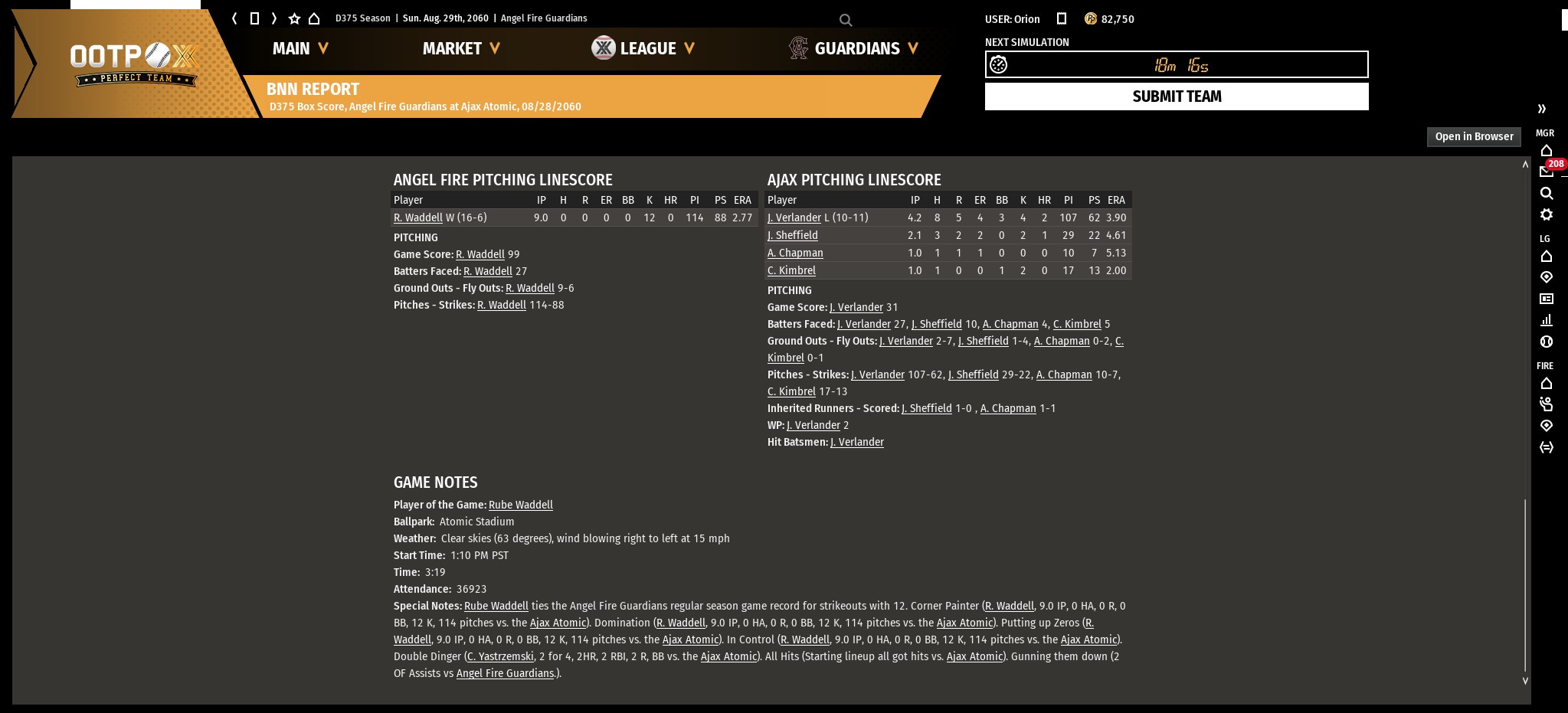 I just won a game in which I got shut down by Warren Spahn but came back against the opponents' bullpen. Curious, I clicked on their Warren Spahn and...it's my old Warren Spahn. Aw, hello, old friend. Glad to see you're doing well. Good luck to you.