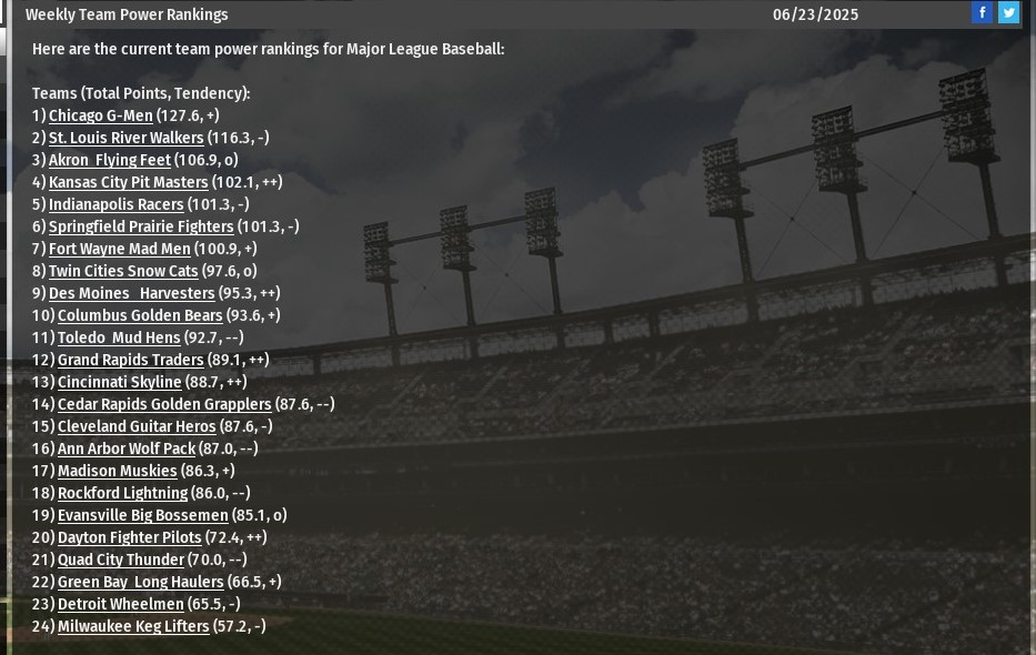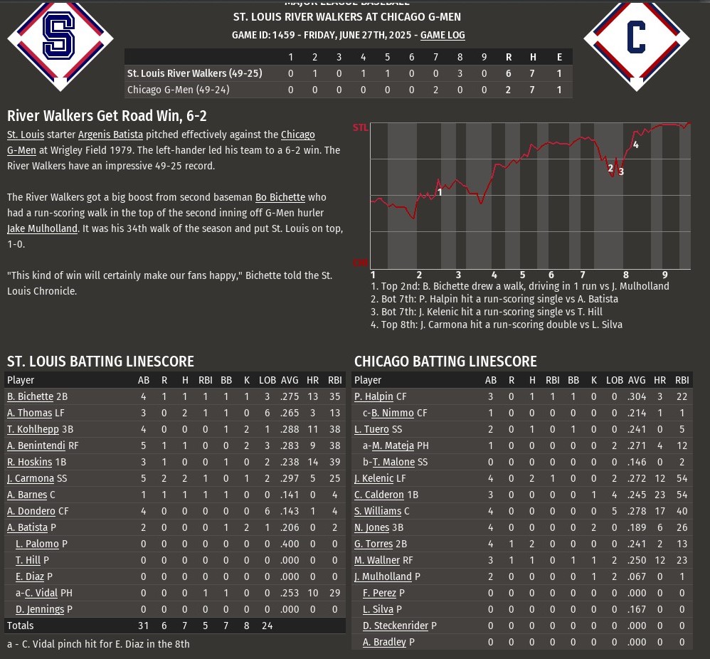 With the bullpen running on fumes, St. Louis got a strong effort from starting pitcher Argenis Batista who limited Chicago two runs over 6.1 innings to help the River Walkers post a 6-2 win at Wrigley Field (1979). Batista (9-3) allowed the two runs on four hits. He struck out four and walked two and exited after allowing a one-out RBI single to Petey Halpin in the seventh. With runners at first and third and one out, and St. Louis leading 3-1, Luis Polomo took over and got pinch-hitter Michael Mateja to fly out for the second out. Tim Hill then got the ball, only to allow an RBI single to Jarred Kelenic which made it 3-2. The Walkers then decided to go to closer Edwin Diaz with Cruz Caldron and his National-League best 23 homers coming to the plate. Diaz got him to fly out to quell the threat. St. Louis added a trio of insurance runs in the top of the eighth to gain a comfortable lead. Andrew Benintendi and Jean Carmona sandwiched doubles off reliever Luis Ramon Silva around an intentional walk to Rhys Hoskins to score the inning's first run. Carlos Vidal later coaxed a bases-loaded walk, making it 5-2. Alek Thomas chased in the inning's final run with a two-out single off Drew Steckenrider. Dan Jennings handled the final two innings for St. Louis without allowing a run. The River Walkers had built their 3-0 lead with single tallies in the second, fourth and fifth innings against Chicago starting pitcher Jake Mullholland, who suffered just his second loss of the season. A bases-loaded walk to Bo Bichette in the second drove in the first run. The fourth saw Carmona leadoff with a triple and score on an Austin Barnes sacrifice fly. Bichette led off the fifth with a single, moved to second on an Alek Thomas bunt and scored on a throwing error by catcher Steve Williams on a ball hit by Tanner Kohlhepp. |