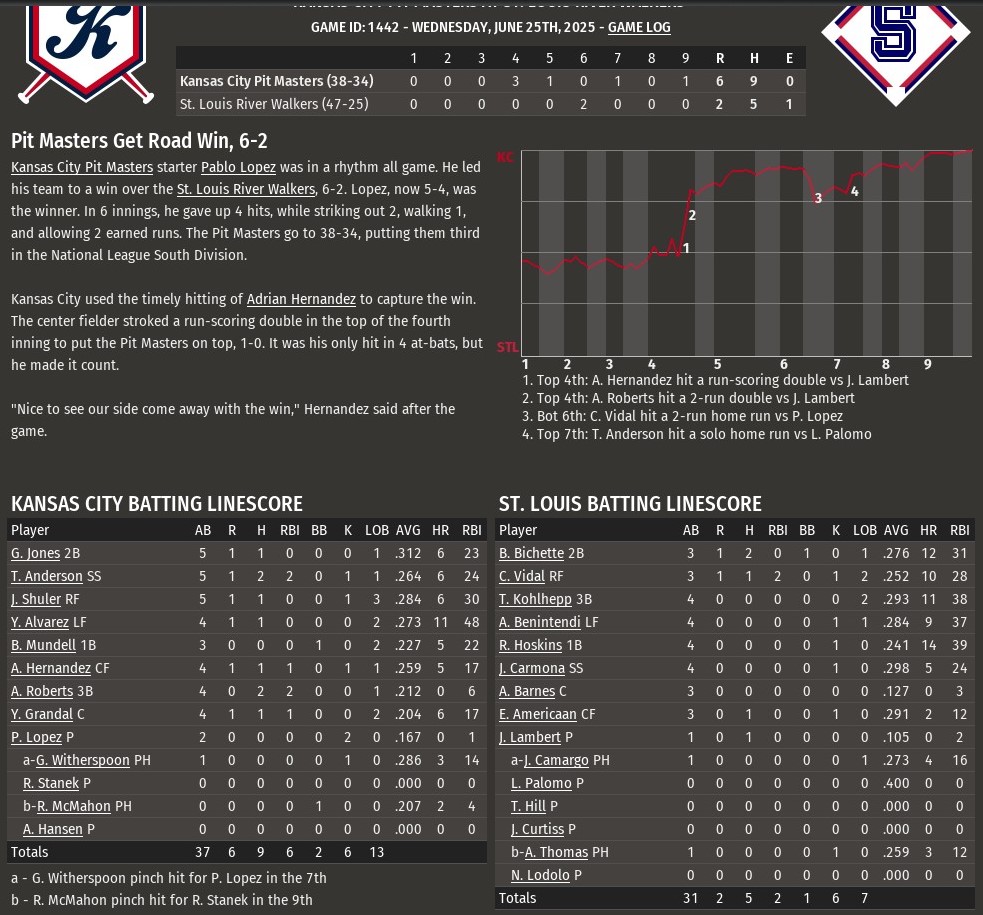 Kansas City jumped on St. Louis starting pitcher Jimmy Lambert for three two-out runs in the top of the fourth inning and rolled on to a 6-2 win at Busch Stadium (1997). The win gave the Pit Masters a split of the quick two-game series. A lead-off single from Tim Anderson, who was eliminated when Josh Shuler hit into a force play, and another single from Yordan Alvarez set things in motion against Lambert in the fourth. Adrian Hernandez drove in the first run with a double. Andrew Roberts followed with another two-bagger, scoring Alvarez and Hernandez. The Masters added another run in the fifth after Greg Jones tripled and then scored on an error by first baseman Rhys Hoskins. St. Louis would pull to within 4-2, but Kansas City would get those runs back behind solo homers from Anderson (off Luis Polomo in the seventh) and Yasmani Grandal (in the ninth off Nick Lodolo). Pablo Lopez (5-4) allowed two runs on four hits over the first six innings. Ryan Stanek took care of the seventh and eighth. Austin Hansen set the River Walkers down in order in the ninth. |