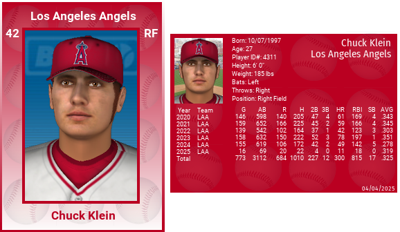 Angels star hitter Chuck Klein socked his 300th career homer today as the Los Angeles Defeated the Amsterdam Smokies 8-2. Klein had 3 hits on the day and slugged the milestone homer off of Bill Wynne. Monte Irvin and Kevin Bell had 3 RBI's each and Jim Whitney improved to 3-0 on the season. In 2023 Klein hit 78 homers and 197 RBI's and is one of the best players historically in the league. Bob Feller pitched a game for the Chicago Cubs by striking out 16 batters as Chicago triumphed over the Oklahoma City Colts 11-1. Feller pitched 7 innings to get the 16 K's and allowed 2 hits one of which was a Franmil Reyes homer. Feller is now 2-0 on the season. Bris Lord drove in 4 runs and Joe Panik had 3 hits for the victorious Cubs who are in first place in the NL Central with a one game lead over the Albuquerque Blackbirds. In a game of baseball teams in obscure markets, Gene Alley collected 6 hits to lead the Fargo Horsemen to an 11-9 win in 12 innings over the Grand Junction Gold Rush Alley had 6 hits and 4 RBI's while Pepe Mangual drove in 3 runs for Fargo who have steadily climbed to 7-9 on the year. George Van Haltren continued the high achievement day 15 strikeouts for the St Louis Cardinals as they blanked the Grand Rapids Crawdads 9-0. Van Haltren fanned the 15 over 8.2 innings. Harry Wolter drove in 5 runs and Dick Egan drove in another 3 to lead the Redbirds on the rampage and a 10-6 record. This Grand Rapids team is now 9-7 so they are not the usual variety. |