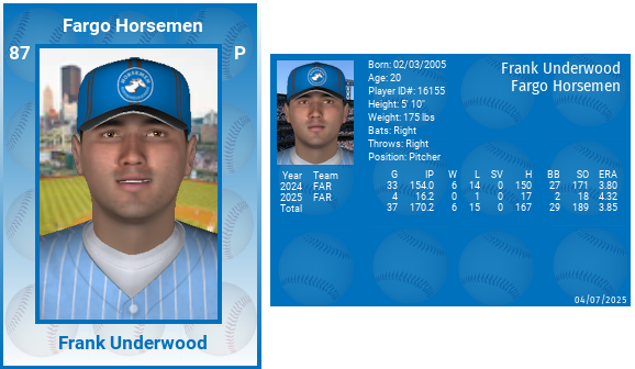 NL Central 1. Mobile Swordfish Managed by: Nick Ross - 3rd season Top Players: Jack Clements, Hughie Jennings, Ben Sanders Top Prospects: Irv Ray, Daniel Robertson, Ron Hunt Comments: not a great team but .500 season is not out of question 2. Birmingham Hillcats Managed by: Sean Cain (2nd season) Top Players: Milt Pappas, Red Murray, Joe Gaines Top Prospects: Levi Meyerle, Tony Conigliaro, Tyson Ross Comments: They will probably be very bad again in their 2nd season, but they have some solid prospects including Tony C's second chance 3. Madison Monarchs Managed by: Gustavo Calderon (2nd season) Top Players: Carl Taylor, Mellie Wolfgang, Joe Presko Top Prospects: Wally Schang, Carlos Carrasco, Comments: they are still developing slowly, Carrasco made the team for 2025. 4. Grand Rapids Crawdads Managed by: Max Parker (3rd season) Top Players: Dolph Camilli, Chet Ross, Elmer Knetzer Top Prospects: Birdie Cree, Jack Flaherty, Brook Jacoby Comments: a team that will be mired in another 100 loss season as they don't have much of a core. 5. Morgantown Cottonmouths Managed by: Tom Halifax (1st season) Top Players: Mel Parnell, Hank O'Day, Charlie Gelbert Top Prospects: Scott Downs, Ted Kennedy Comments: first year team and they will struggle to win 40 games 6. Milwaukee Brewers Managed by: Cesar Florez (2nd season) Top Players: Frank Thomas, Lady Baldwin, Denny Lyons Top Prospects: Bernie Friberg, Al Zarilla, Gus Triandos Comments: Finished in 2nd in 2024, but missed playoffs, they are a fringe playoff team once again in 2025 7. Pittsburgh Pirates Managed by: Ronnie Courtney (6th season) Top Players: Jerry Nops, Gio Urshela, Bid McPhee Top Prospects: Dan Stearns, Joe Gordon, Sam West Comments: disappointing 2024 season and not much hope that things will change in 2025 as this team seems to be in decline 8. Chicago Cubs Managed by Joe Maddon (11th Season) Top Players: Bob Feller, Vic Willis, Orval Overall Top Prospects: Jim Lonborg, Daniel Cabrera, Ryan Yarbrough Comments: Maddon is now 70 and still managing, this is an unusual Cubs team that has the pitching but not much hitting, could contend 9. Louisville Bats Managed by: Mike Zoeller (5th Season) Top Players: Johnny Vandermmer, Rich Nye, Bill White Top Prospects: Heinie Manush, Jimmy Dykes, Ryan Braun Comments: they got a lot better in 2024, but are they good enough to play with Milwaukee and Cincinnati? 10. Rome Thoroughbreds Managed by Joe Quinn (1st season) Top Players: Jack Sanford, Christopher Soprano, Marcus Jensen Top Prospects: Wilson Ramos, Carl Sawatski Comments: first year team playing in Italy, not much to look forward to. Odd how they drafted Christopher Soprano 11. Cincinnati Reds Defending World Champions Managed by Adam Sinatra (1st season) manage Jacksonville Beach Bums in 2024 Top Players: Larry Doby, Roy Oswalt, Jose Fernandez Top Prospects: Carl Lundgren, Hal Gregg, Travis Fryman Comments: they are the defending world champions but did lose George Davis to free agency should win the division and the rest could be a repeat 12. Aruba Jackrabbits Managed by: Jason Evans (2nd season) Top Players: Bill Swift, Van Mungo, Matt Wieters Top Prospects: Felix Mantilla, Buster Adams, Mike Zunino Comments: 2nd year team and 60 wins would be a mircale NL Midwest 1. Wichita Hawkeyes Managed by: Alex Jenkins (2nd season) Top Players: Harry Howell, Don Hurst, Fritz Peterson Top Prospects: Rico Carty, Red Faber, Eddie Robinson Comments: Decent team this year, could hit .500 2. New Orleans Zebras Managed by: Ruben Perea (3rd season) Top Players: Larry Walker, Ken Griffey Jr, Elmer Smith Top Prospects: Bruce Bochte, Charlie Frank, Stephen Piscotty Comments: Very strong team that just missed playoffs in 2024, and should contend hard in 2025 3. St Louis Cardinals Managed by: Chris Piatt (6th season) Top Players: Nolan Arenado, George Van Haltren, Harry Wolter Top Prospects: Carlos Guillen, Duke Sims, Bob O'Farrell Comments: took steps back in 2024, but look revamped for 2025, did lose Phil Douglas to the market 4. Winnipeg Wolf Pack Managed by :Mike Carlson (2nd season) Top Players: John Fulgham, Laynce Nix, Evan Gattis Top Prospects: Dustin Ackley, Curt Young Comments: this is a bad team that should be as bad as they were in 2024 5. Memphis Cougars Managed by: Roger Candelo (6th season) Top Players: Bryce Harper, Juan Gonzalez, James Paxton Top Prospects: Robin Yount, Al Leiter, Russell Martin Comments: Yount made the team for 2025, they should have a shot at the NL Crown if all goes well as they have drafted well 6. Little Rock Sunbirds Managed by: Joe McEachern (3rd season) Top Players: Ross Barnes, Steve Rogers, Justin Verlander Top Prospects: Yordan Alvarez, Bob Welch, Orel Hershiser Comments: should fight for .500 in 2025, but they have some great future players for sure 7. Duluth Champions Managed by: Jon Kidman (2nd season) Top Players: George Decker, Derrel Thomas, Elliott Maddox Top Prospects: Abner Powell, Milt Shoffner, Joe Kuhel Comments: 110 losses is consensus for this 2nd year team, they don't have any star power 8. Peoria Oil Barons Managed by: Garrett Hayes (1st season) Top Players: Ned Ryerson, Dan Uggla, Buddy Hield Top Prospects: Billy Williams Comments: should be better than some established teams even in their first year. Team is built around Needle Nose Ryerson, an insurance agent from rural Pennsylvania 9. Tulsa Rattlers Managed by: John Rosen (4th season) Top Players: Brownie Foreman, Jack Smith, Gene Krapp Top Prospects: Steve Brady, Johnnhy Marcum, Jose Jimenez Comments: Got to the NLCS in their first playoff run and they are another favorite to win it all with Foreman and Smith being 2 of the biggest stars in the game 10. Oklahoma City Colts Managed by: Chris Burns (3rd season) Top Players: Fernando Tatis Jr, Tom Seaver, Mark Redman Top Prospects: Bill Eagan, Jeff Niemann Comments: a team that has been better than it is expected and adding Tatis makes them a solid candidate for 90 wins in just their 3rd season 11. L