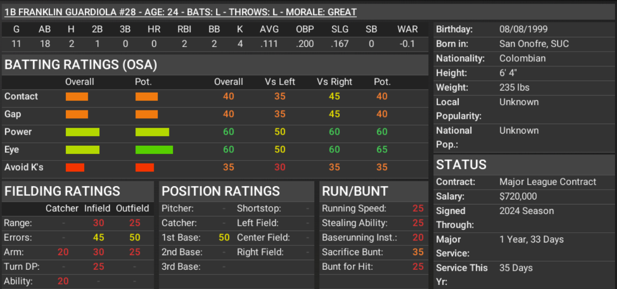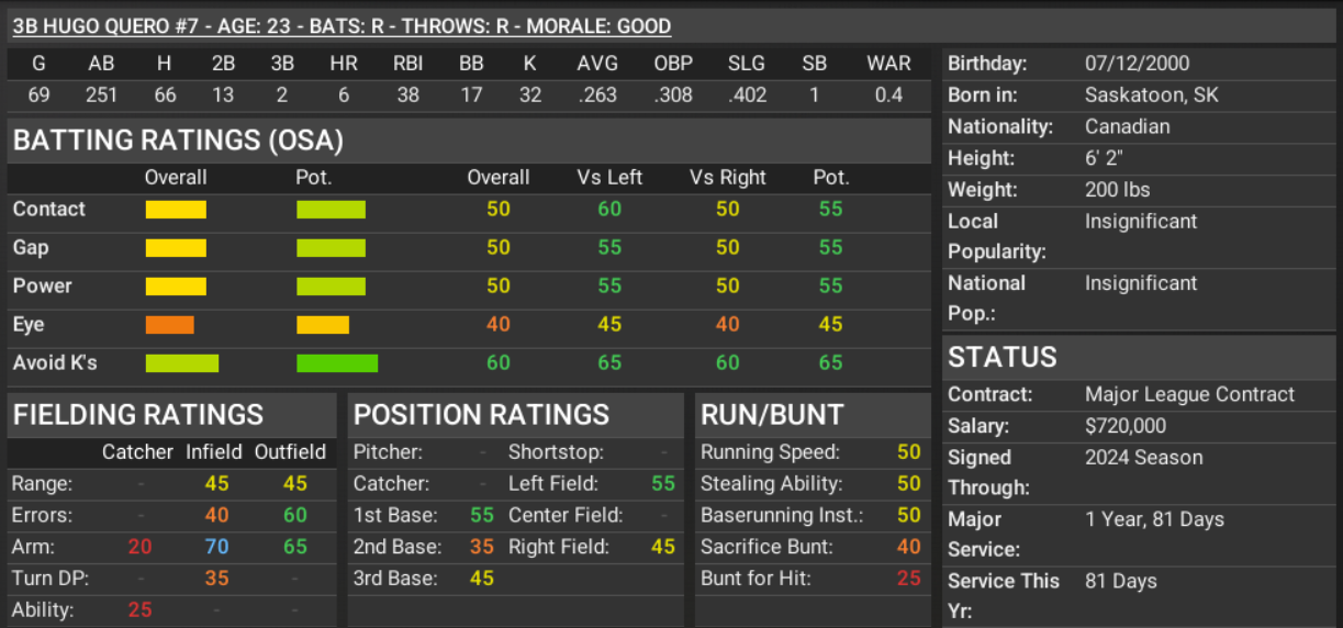 I sopped the players and not seeing anything I wanted, I switched the criteria to "prospect package" and one team offered 2 players that looked interesting and could fulfill needs. The bulk of the team in 27 and under, so any player of value at age 30 or over, is subject to being shopped. ![]() ![]() GM is hopeful that Quero can take over at 1B, freeing up Quiroz for trade. Quero has been a pleasant surprise. ![]() GM anticipates FG to be the every day DH ... it has not gone as planned. Edit: Guardiola's stats in the player stat section are at 3A, where he's a monster, ML not so much. Rumors hint that if the Shires are not in serious contention by the trade deadline, CF Hunt, CL Payne, and 1B Quiroz will be on the move for a package of prospects. Last edited by circlechange11; 07-19-2023 at 06:33 PM. |