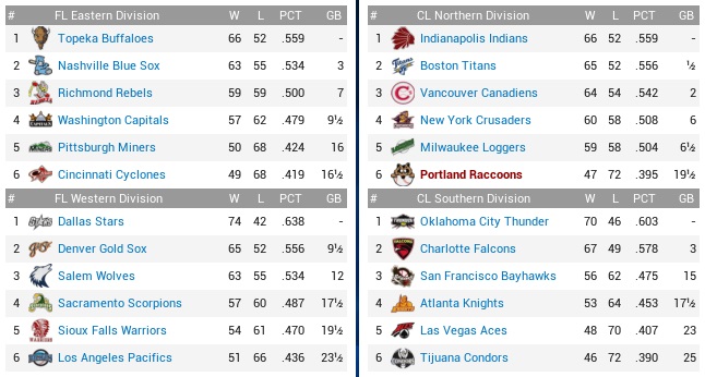 We just haven’t been good at all (4-8) against the Crusaders this season, and the Crusaders hadn’t done well overall. Well, actually they had. Their run differential was +85, and they ranked in the top 3 in both runs scored and runs allowed, and yet they still lingered around at .500 – but they were also due for a breakout, I guess. Projected matchups: Tim Webster (2-2, 3.54 ERA) vs. Frank Pierre (8-10, 3.33 ERA) Nick Brown (10-6, 2.55 ERA) vs. Whit Reeves (12-5, 2.92 ERA) Felipe Garcia (4-10, 4.22 ERA) vs. Angel Javier (6-9, 4.76 ERA) We will finally have an off day after this series to rest them old bones… Game 1 POR: 1B Sharp – SS Yamada – LF Fernandez – RF Greenman – 3B Searcy – C Wood – 2B Sheehan – CF King – P Webster NYC: SS Rice – 1B D. Carroll – RF S. Martin – LF M. Ortíz – C D. Anderson – 3B Watts – CF Pena – 2B Moultrie – P Pierre Tim Webster’s potentially final start for the Raccoons EVER saw him combed with a crowbar, and wound up with a screwdriver. He was clobbered in a 3-run first in which he issued a walk and a wild pitch, then a 2-run homer to Stanton Martin, and it didn’t get any better from there. The Crusaders added single runs in the second and fourth innings, then put two men on in the fifth and it was go time for Webster at that point. Rockburn couldn’t clean up, and those runners scored as well, leaving the Raccoons down by five runs, 7-2. While the Raccoons did precious little apart from leaving a pair of runners in scoring position twice rather than actually getting a clutch hit, and back into the game, Stanton Martin also took Ed Bryan deep in the seventh, making it 8-2, and at that point there wasn’t much else to do other than exploiting Ricardo Huerta’s rubber arm a bit more. Frank Pierre pitched a complete game, not exactly breaking into a sweat at any point. 8-2 Crusaders. Sharp 2-4, 2B; King 2-4, 3B, RBI; Huerta 2.0 IP, 1 H, 0 R, 0 BB, 2 K; The real question is who should replace Webster. Not that he is irreplaceable. Well, he might be for our organization. Game 2 POR: 3B Sharp – CF Fernandez – LF Brady – RF Greenman – 1B A. Martin – C Wood – SS Yamada – 2B Nomura – P Brown NYC: CF P. Javier – 1B D. Carroll – LF M. Ortíz – 3B Watts – SS J. Hernandez – RF Britton – C Williamson – 2B Moultrie – P Reeves What figured to become a pitchers’ duel was spiced up early on with a leadoff homer by Daniel Sharp, and by Brown striking out the first two batters he faced before drilling Ortíz and hitting Watts, and clearly showing that he still was not 100% locked in again. The Crusaders would not get a hit until the fourth inning, but the Raccoons couldn’t scratch Whit Reeves for anything else, either, and so the game remained 1-0 for quite a while. If nothing else, however, three walks in the game and a few other long counts shot Brown’s pitch count skywards and he left after seven innings of 1-hit ball, expending 105 pitches to get there. The Coons offense was not threatening at all, but it’s alright, Nick, we’ve got Bruno and Casas ready, we’ve got you covered. Or maybe Bruno would allow a leadoff hit to pinch-hitter Luis Soto in the bottom 8th, suddenly we were encroached by left-handed bats and we had to change plans on the fly. Moreno came in to face left-handed pinch-hitter Roberto Pena, who then dropped down a bunt, moving Soto to second with one out. Dave Carroll, who saw a 13-game hitting streak drifting away, grounded out poorly to Martin, moving Soto to second. Since I didn’t fancy our chances for a 4-out save from Casas starting with the right-hander Watts any better than if we let Moreno pitch to Martin Ortíz (17 HR), a left-hander, we stuck with Moreno. Ortíz doubled, and the game was tied. Brownie bit into a towel in the dugout. The Raccoons couldn’t touch Charlie Deacon with a 15-foot pole in the top of the ninth, and in the bottom of the same inning Kaz Kichida was wild, and then got cashed in on by Ron Williamson with a walkoff double. 2-1 Crusaders. Sharp 3-4, HR, RBI; Brown 7.0 IP, 1 H, 0 R, 3 BB, 6 K; The only other Raccoon that reached base besides Sharp was Yoshi Nomura with a single. Everybody else went up, looked like a sad jester at what Reeves and Deacon (DEACON!!) flung at them, and sat down again. Poor Brownie. You DO deserve a better team. Game 3 POR: 1B Sharp – CF Fernandez – LF Brady – RF Greenman – C L. Ramirez – 3B Searcy – SS Yamada – 2B Sheehan – P F. Garcia NYC: SS Rice – 1B D. Carroll – RF S. Martin – C D. Anderson – CF P. Javier – 3B Watts – LF Britton – 2B Moultrie – P A. Javier There was rain and a rain delay lasting half an hour quite early in this game, and before and after that the Raccoons left two men on base in the second and third innings. In the bottom 3rd then Gary Rice hit a homer just over the wall, while Leon Ramirez’ shot in the top 4th fell just a few feet short and was caught by Paco Javier. What would the Critters have to do to get on the board? No clue, they just didn’t. Top of the sixth, they got three singles, loaded the bases, and it ended with a soft fly to center by Sheehan that was also nabbed by Javier, who seemed to be everywhere. Like Brown the day before, Garcia pitched quite a good game, also with some ill control, but not a fatal cause of such, but other than Brown he already left on the hook after seven innings of 4-hit, 1-run ball, and remained on the hook when despite an error that allowed Brady to reach base to start the eighth, the team couldn’t pull their heads out of their asses and didn’t score again. The Crusaders got a completely unnecessary run off Angel Casas in the bottom 8th when he drilled Rice to start the inning and they brought him around masterfully, you know, with a hit. And then Charlie Deacon drilled Sheehan to start the top 9th, but … oh, just go all away. 2-0 Crusaders. Garcia 7.0 IP, 4 H, 1 R, 1 ER, 4 BB, 4 K, L (4-11); I vaguely re
