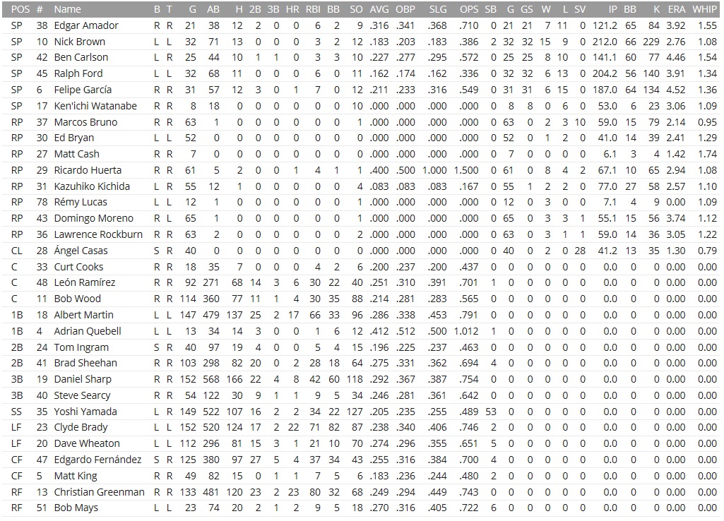 It was all drifting away from the Indians, who were never expected to compete, had competed, but were now four games out, and scrambling after the Titans. They were 5th in runs scored and 7th in runs allowed, and there was a case to be made for that those numbers were not deserving of the playoffs in the first place. We were 7-8 against them this season. Projected matchups: Nick Brown (12-9, 3.03 ERA) vs. Patrick Moreau (6-4, 3.86 ERA) Kazuhiko Kichida (1-2, 2.80 ERA) vs. Kevin Edwards (0-1, 4.50 ERA) Ralph Ford (6-11, 3.88 ERA) vs. Bob King (16-13, 4.43 ERA) Kichida makes a spot start here with Webster’s presence required in AAA with our supply on pseudo-starters severely depleted, and with Garcia still suspended for the middle game. Garcia moves to Amador’s slot, who is still in medical limbo. Game 1 POR: 3B Sharp – SS Yamada – LF Brady – RF Greenman – 1B Quebell – C Wood – CF Wheaton – 2B Sheehan – P Brown IND: 1B Stevens – RF Wales – LF Alston – 3B D. Lopez – C Paraz – CF J. Alvarez – 2B J. Zamora – SS W. George – P Moreau … and Brownie’s control remained well off. He walked a man in the first, and then Paraz to start the second. Alvarez singled to shallow left, out of Brady’s reach, and Zamora followed him right to the same spot. Paraz was sent around third, but Brady still had an arm and lasered him out at home. Next, Will George grounded to third, where Sharp had another not so sharp moment and sailed his throw to second into centerfield. Moreau managed to make contact, a fly to Brady, but that was enough to plate an unearned run. Brown walked a man in every inning until he finally found himself in the fifth, struck out Moreau and Stevens, and Dale Wales (3,657 hits and still counting) grounded out. Then he even got support, with Brady and Greenman bashing back-to-back bombs in the sixth, giving him a 2-1 lead. Brown was still around for the bottom 7th, fell 3-0 behind Alvarez, but the Indian then poked and grounded out. Will George hit a 2-out double in the inning, but Brown struck out Matt MacKey to finish on a high note. Sharp, who was high on the butcher list, led off the top 8th with a home run off Tommy Wooldridge, 3-1. Bruno and Moreno took care of the top of the lineup in the eighth, Iemitsu Rin culled some Cooons in the top 9th, before Angel Casas was assigned to the bottom 9th and got the Indians on two poor grounders and a strikeout to Paraz. 3-1 Brownies! Sharp 3-4, HR, RBI; Brown 7.0 IP, 3 H, 1 R, 0 ER, 4 BB, 7 K, W (13-9); Ever since the Break, it has been a struggle for Brownie. While he has only gained .15 ERA, he has walked 29 batters against 61 strikeouts, which is not a *bad* ratio, but he’d been at 39/151 before the All Star game… Edgar Amador was diagnosed with a strained oblique, but it is a mild strain and he will be able to pitch again this year, but not this week. So, nothing changes with our plans: Kaz on Wednesday, Garcia on Friday, and a lot of prayers all week long. Next, Kaz’ first major league start. He has started as late as last season in AAA, so this is not totally out of the ordinary for him. We have enough relievers – if he goes five, maybe six, that’ll be fine. Dave Wheaton gets another start. He’s 4-for-5 with 3 HR against Edwards. We need every little bit we can get. Game 2 POR: 3B Sharp – SS Yamada – LF Brady – RF Greenman – 1B Quebell – C Wood – CF Wheaton – 2B Sheehan – P Kichida IND: 2B Sepúlveda – 1B Stevens – LF Alston – 3B D. Lopez – C Paraz – CF J. Alvarez – RF MacKey – SS Montray – P Edwards Kaz sat down the first 11 Indians before Ron Alston dropped a single into shallow right and Greenman overran it right away for an extra base, but when Lopez popped out to end the frame, the Coons remained 1-0 ahead, courtesy of a Yamada single, his 51st stolen base, a Brady single, and a sac fly by Greenman in the top of the same inning. Clyde Brady clouted one in the top 6th for a solo home run, moving the score to 2-0, and Kichida’s command was running away in the bottom 6th. The Indians had two on with two out, but Ron Alston was coming to the plate, so we sent for a lefty in Ed Bryan. Alston singled, loading the bases, and we were now in the mood for some Raw Lockburn to face David Lopez. Rockburn got a poor grounder and played it himself to first to end the frame. An error got the Indians going in the seventh. No, it was not Sharp, for once, but Sheehan. Rockburn left with Paraz on first and one out, for Moreno to come in, but he gave up two hits and a run before Marcos Bruno appeared to surrender Sepúlveda and preserve a 2-1 advantage through seven. The mad scramble continued, however. After Yamada had killed a weak attempt at offense with a double play grounder to short in the top 8th, Bruno gave up two singles right up the middle in the bottom of the inning. Rémy Lucas came in to face the switch-hitter, but natural lefty Paraz, who singled to center. There Matt King was now playing after an earlier double switch, and he fired a rocket towards home to throw out the lead runner Simon Stevens. Then we went to Angel Casas, who gave up a drive to center off Craig Bowen’s bat, but King made another strong play on that. Casas had entered in another double switch, along with Steve Searcy, who took over at third base, so that Casas wouldn’t be the fifth Coon to bat in the top 9th. Sure enough, Searcy then came to the plate with two on and two out and rammed a double off the centerfield wall that plated a pair. Angel then fell behind every batter in the bottom 9th, but one walk was all the Indians could mount. 4-1 Coons. Brady 3-3, BB, HR, RBI; Martin (PH) 1-1; Searcy 1-1, 2B, 2 RBI; Kichida 5.2 IP, 2 H, 0 R, 1 BB, 0 K, W (2-2); Casas 1.1 IP, 0 H, 0 R, 1 BB, 0 K, SV (23); Wheaton went oh-fer, by the way, and was removed in the first double switch. Clyde Brady, however, hit his 100th career home run. But well, the Raccoons ruined my summer, it’s only fai
