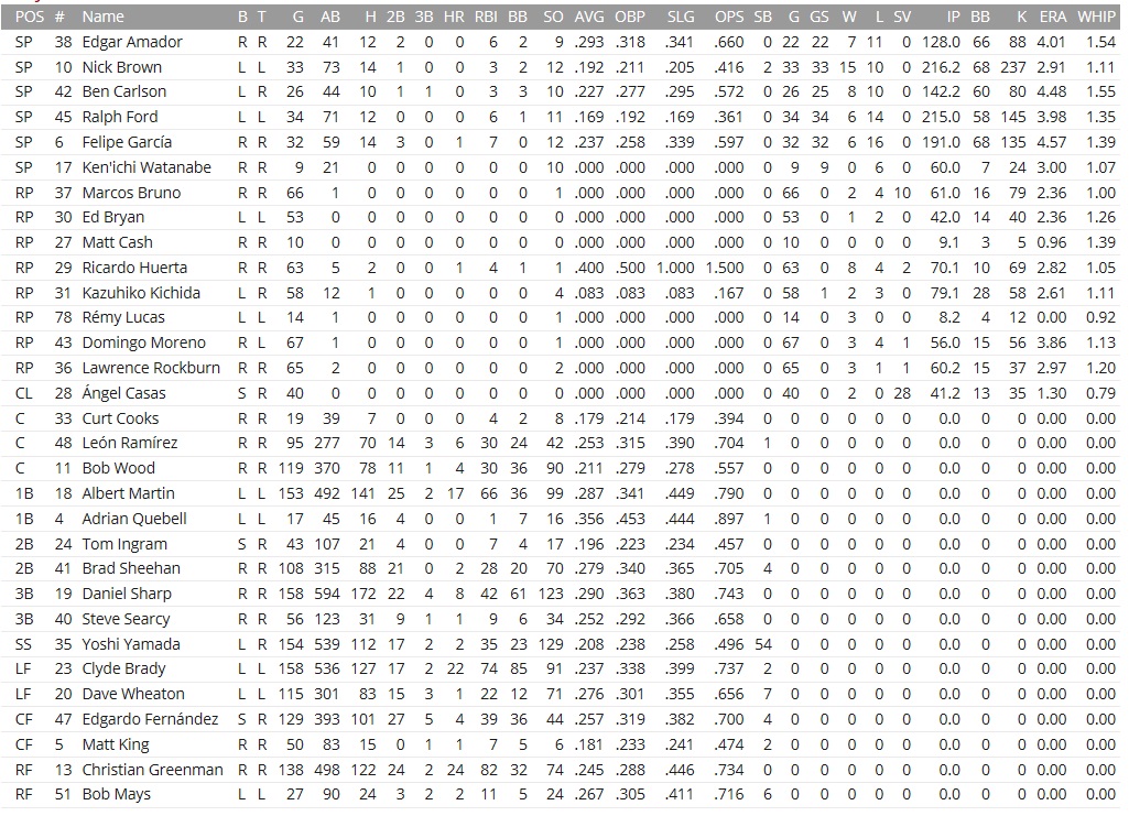 The third-most runs were scored both offensively and defensively when the Knights were involved. Their rotation ERA was 4.47 (10th), bad enough, but they also had a 4.17 ERA bullpen, which was soundly the first in the league. Yet, they still won four of six from us this season. Projected matchups: Edgar Amador (6-11, 4.39 ERA) vs. Ed Wallace (2-1, 4.50 ERA) Ralph Ford (6-12, 3.93 ERA) vs. Jong-suk Lee (8-18, 5.09 ERA) Felipe Garcia (5-15, 4.65 ERA) vs. Larry Cutts (17-6, 3.40 ERA) Game 1 ATL: RF R. Lopez – CF Ware – LF J. Morales – C J. Lopez – SS Luján – 2B J. Miller – 1B J. Gutierrez – 3B Pena – P E. Wallace POR: 3B Sharp – 2B Sheehan – LF Brady – CF Greenman – 1B Quebell – RF Mays – SS Yamada – C Wood – P Amador The Knights had left-handed bats sitting in the #2 and #3 holes, and those gave Amador a heck of trouble. He only once retired any of them, but the right-handers on the other hand were axed down with great furor, and Ware and Morales were stranded both in the first and third innings. The Coons left on a pair in the second, then had Ed Wallace issue walks to Brady, Greenman, AND Quebell to start the bottom 4th. Mays romped a pitch up the middle for an RBI single, and Yamada hit a sac fly before Wood singled to reload the bases, and then the Fat Cat drew a Fat Walk – and was all exhausted arriving at first base. That bases-loaded walk to the pitcher made it 3-0, Sharp popped out to second, but Sheehan would score a pair with a 2-out single to give us a 5-0 lead. The Knights got on the board the next inning. Amador foolishly drilled Wallace with a pitch, and Ware hit a 2-out single, moving the pitcher to third base. Wood had a ball scoot through his legs to bring in the run before Jose Morales could hack himself out – the first left-hander retired by Amador. Bob Mays would drive in another run in the seventh inning, while Jorge Lopez managed to take Ed Bryan deep in the top 8th. Bryan had already retired Ware and Morales, and we thought, well he can pitch to one right-hander every fortnight – no. Just no. Cash took over, but put a pair on in the top 9th. With Casas not showing much in the way of strikeouts and Bruno having an obscene rate of about 12 K/9, Marcos came out, and struck out Rodrigo Lopez to end the game and notch a save. 6-2 Coons! Quebell 2-3, BB; Mays 3-4, 2 RBI; Amador 7.0 IP, 6 H, 1 R, 0 ER, 3 BB, 4 K, W (7-11); Danny Sharp extended a 10-game hitting streak at the last possible moment, with a 2-out single in the bottom 8th. Game 2 ATL: LF R. Lopez – SS Luján – CF J. Morales – RF J. Garcia – 1B J. Gutierrez – 2B J. Miller – C Defrese – C Pena – P J.S. Lee POR: 3B Sharp – RF Mays – LF Brady – CF Greenman – 1B Martin – SS Yamada – 2B Ingram – C Cooks – P Ford The Knights drew three walks, but no hits and no runs from Ford in the first three innings before Jose Morales fired a home run to lead off the fourth, giving them a 1-0 lead. They continued to load the bases, including the fourth walk on the day, but didn’t score when Ford struck out Lee to end the inning. While it was going like gum for the Raccoons against an 18-game loser, Juan Gutierrez homered to start the top 6th, 2-0, but at least Bob Mays finally made contact in the bottom of the inning and drilled a solo home run himself to get back to 2-1. By then Ford was already out of the game, leaving after five and two thirds with two men on and the right-handed leadoff man Rodrigo Lopez up, merely batting .310. Lee was hit for the next inning, but not that it helped the Raccoons much. The top 9th almost saw the score explode after Rémy Lucas came in with two out and nobody on, got a very good grounder to Tom Ingram from Jose Morales, and Ingram made another one of those colossal throwing errors. Lucas walked the next batter, and Bruno came in to get the final out. We faced Manuel Reyes in the bottom 9th, still down 2-1, but his first pitch was hit for a double up the leftfield line by Al Martin. Yamada lined to left, but Rodrigo Lopez caught it, and after that Wheaton hit for the dirt bag Ingram. Both him and Sheehan would drive balls to deep center, but none of them got them past Morales, and the Raccoons took one of those sour losses that still have you cry on Sunday. 2-1 Knights. Martin 2-3, BB, 2B; Huerta 1.1 IP, 0 H, 0 R, 0 BB, 1 K; Time to erase Tom Ingram from any depth chart we have. As if batting .202 wasn’t enough, he was actively sabotaging his team with a .948 fielding percentage. But I’m glad we could help out You-suck Lee, or whatever that guy was called. Daniel Sharp has a 12-game hitting streak and is making a bid for a .300 season very late here. He hit .301 in ’01 and .304 in ’04. So he might end up at .305? Game 3 ATL: LF R. Lopez – 1B Ware – CF J. Morales – RF J. Garcia – C J. Lopez – SS Luján – 2B J. Gutierrez – 3B Pena – P Cutts POR: 1B Sharp – 2B Sheehan – LF Brady – RF Greenman – CF Fernandez – 3B Searcy – SS Yamada – C Wood – P F. Garcia After Morales held onto the Knights’ win last night, he gave the Furballs a headstart in the rubber game, dropping Fernandez’ soft fly for an error to plate Sheehan from third base in the bottom 1st. While the Knights struggled against Garcia – of all people – and capitally failed even when getting a man to third base with one out, like in the fifth inning, Cutts was victimized by ugly 2-out defense by his team. When Garcia hit a ball to the outfield with two out in the bottom 2nd, Rodrigo Lopez took an awkward route, missed it, and it became a double, leading to Sharp’s RBI single and a 2-0 score. Cutts had to whiff the guy to come up with two outs, or bad things would happen. Unfortunately for the Coons, he learned that whiffing part fairly quickly and beat up Fernandez, Wood, and Sheehan in succession in the third through fifth innings. In the sixth Yamada was up with two on and two out, but Yamada by now was automatic out and