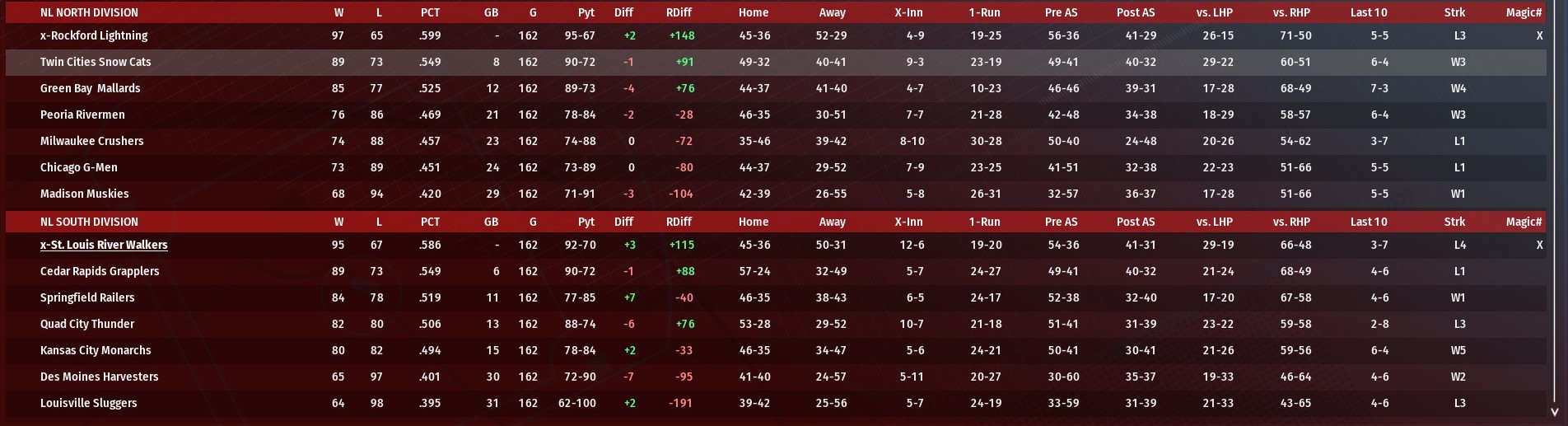 National League championship series: St. Louis River Walkers vs. Rockford Lightning (97-65) Postseason histories Akron: Division titles:2022, 2025, 2034, 2036; AL titles: 2025 Detroit:Division titles 2024, 2026, 2035, 2036. WS titles: 2024, 2026, 2035. St. Louis Division titles: 2018, 2019, 2025, 2026, 2028, 2030, 2031, 2036; NL titles: 2026, 2028, 2030; WS titles: 2018, 2025. Rockford: Division titles: 2033, 2036. NL titles: 2033 Last edited by rink23; 01-22-2022 at 04:40 AM. |