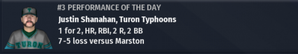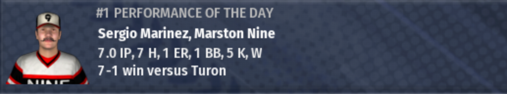 The Marston Nine have won Pro Cup XVIII. It's their first IPA title. It was 1-0 Turon going into the bottom of the 8th, and it looked like the Typhoons might storm back from a 3-1 series deficit to steal the Pro Cup away from the Nine. But with runners on 1st and 2nd, Zeb Morse flared a single into center field to tie the game, and then Ryan Gray blasted a 3-run homer to right-center to give Marston a 4-1 lead, which Turon could not overcome in the 9th inning. The title for the Nine was secured with a line drive catch by the 1st baseman Pat Fischer. |