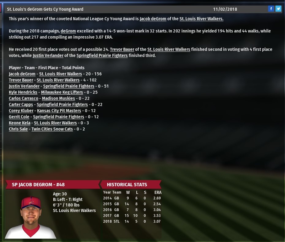 MBL news: River Walkers' deGrom wins NL Cy Young award