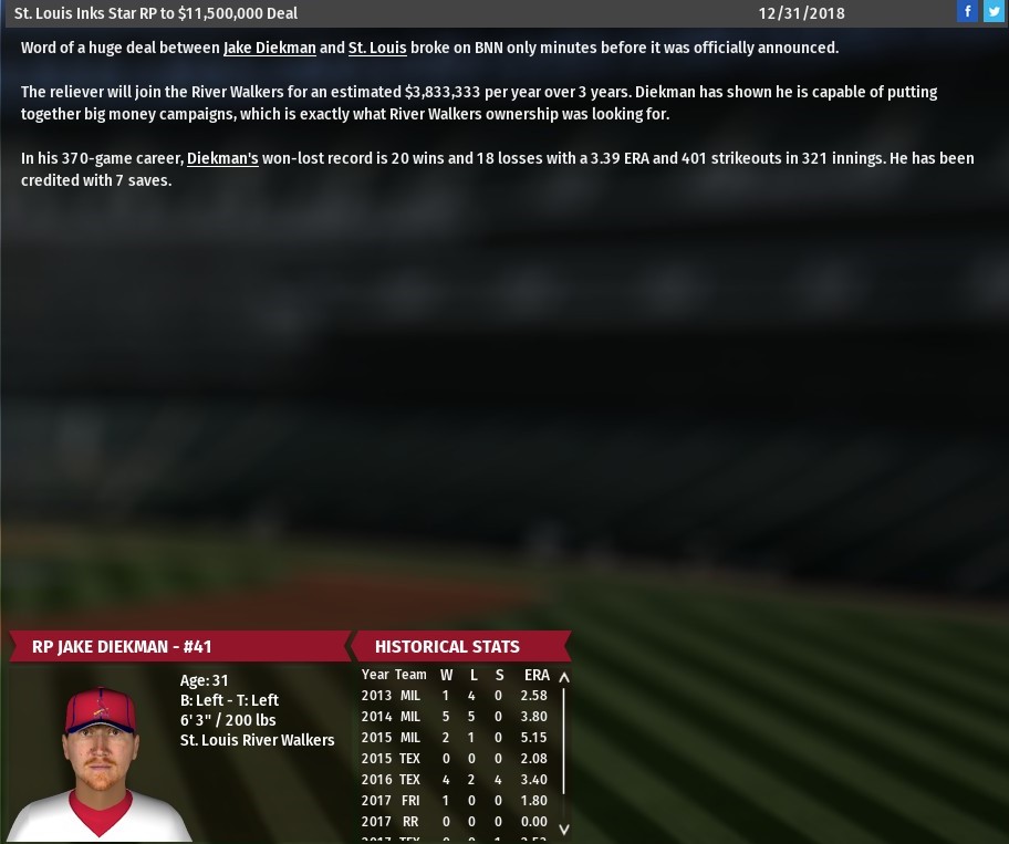 Diekman, 31, was with the team in 2018 during which he appeared in a team-high 76 games. He posted a record of 7-5 with a 2.74 ERA and a WHIP of 1.17. Last edited by rink23; 01-08-2019 at 06:55 AM. |