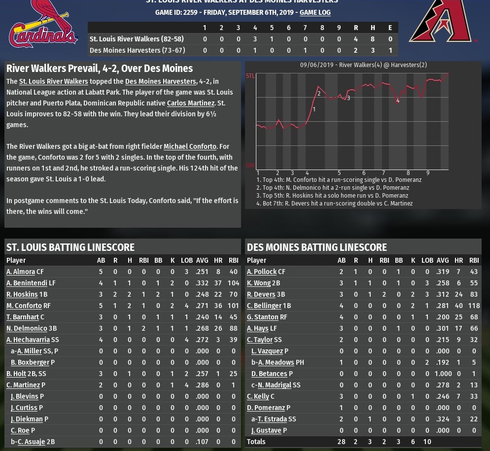 Manny Pina cranked a three-run homer off Chris O'Grady in the top of the first inning to help stake the River Walkers to a 4-0 lead. Chicago, however, gradually began to chip away from it against Nola. Josh Donaldson had an RBI double in the bottom of the first and then drove in Chris Owings with a single in the third. The G-Men then took Nola to the woodshed in the fourth, scoring six times as the Walkers were reluctant to go to their bullpen after seeing its relief core get major work in a 9-3 loss in the first gamer of the twinbill. Chicago strung together seven hits in the inning. Matt Carpenter had the lone multi-run hit with a double which scored the inning's final two runs. Chris Owings hit a solo homer. Brandon Crawford hit his second triple of the game, driving in a run. Shohei Ohtani and Donaldson both had run-scoring singles. O'Grady silenced St. Louis for the next three innings before exiting before the start of the fifth. Seven relievers combined to shutout the River Walkers the rest of the way. Greinke, who earned the win in the opener in relief, did the same in the nightcap by getting the first out of the seventh inning. Michael Feliz capped the game with a scoreless eighth and ninth. |