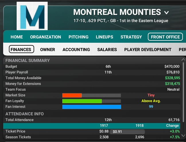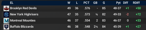 While San Francisco seems to have the Western League locked down, the Eastern League is up for grabs. Four teams are in the hunt, New York with the big payroll, Buffalo who has not been in the Series since 1901, Brooklyn who has not been competitive in a decade and last year's surprise winner, Montreal.