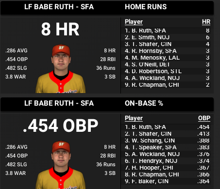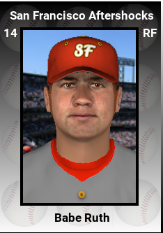 Babe Ruth has only pitched 2 innings in the first month of the season so apparently he has made the switch to the outfield. Last year he put up an incredible 14+ WAR season doing both. But now as a full time slugger he has 8 home runs on May 2, an incredible pace for the WBL. In fact, he is the only player in the Aftershocks starting line up who has a home run. His OBP is .521 and OPS is 1271. This should get interesting.