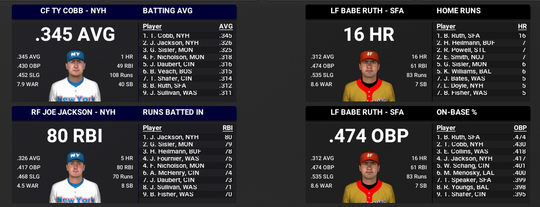 *Ty Cobb gets hit #3000 and wins the batting title in the Eastern League. It was his first batting title since 1915. *Montreal wins the pennant and will play San Francisco in the World Series. It is the first time for the Montreal franchise in the Series, while San Francisco will go for the third straight year. SF is still looking for their first title. *Babe Ruth had another incredible season. He finishes first in homers (16), OBP and OPS. Batting WAR was 8.6 He also went 27-14, first in wins, 2nd in ERA and 6.0 in pitching WAR for a total WAR of 14.6. That would certainly make it the greatest season in WBL history. Rube Waddell's 14.4 WAR from the mound in 1903 is the only player above 14 previously.