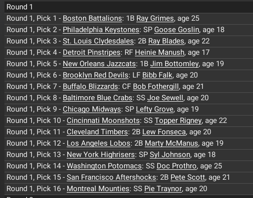 It may be that whoever wins the battle in the East will just be fodder for the far superior San Fran team in the World Series but nevertheless, there is a tight race between Buffalo, Baltimore and New York with Montreal just a bt off the pace. Buffalo has not won the pennant since 1901 but they are getting a big season from Harry Heilmann. New York looks like the favorite to me, but OOTP likes Baltimore's chances.
