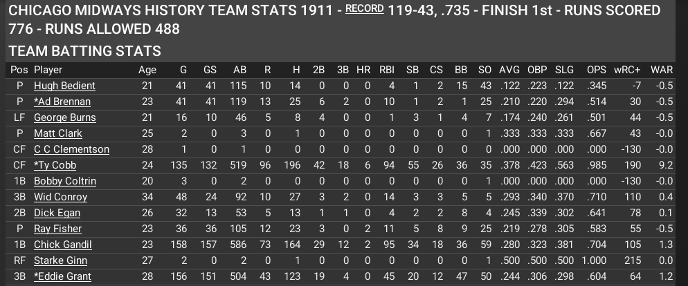 The San Francisco Aftershocks featuring Babe Ruth, Tris Speaker and Rogers Hornsby, among others, are playing .736 ball heading into August. They have a chance to beat the wins total run up by the league's greatest team thus far, the Chicago Midways of 1911 who went 119-43 (a .735 percentage). For good measure, the Midways swept a very good Washington team in the World Series.