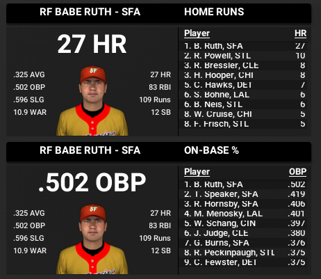 27 home runs from Babe Ruth shatters the WBL record as the Bambino leads SF to 111 wins in the Western League. He also posts a .502 OBP and a 10.9 WAR season.